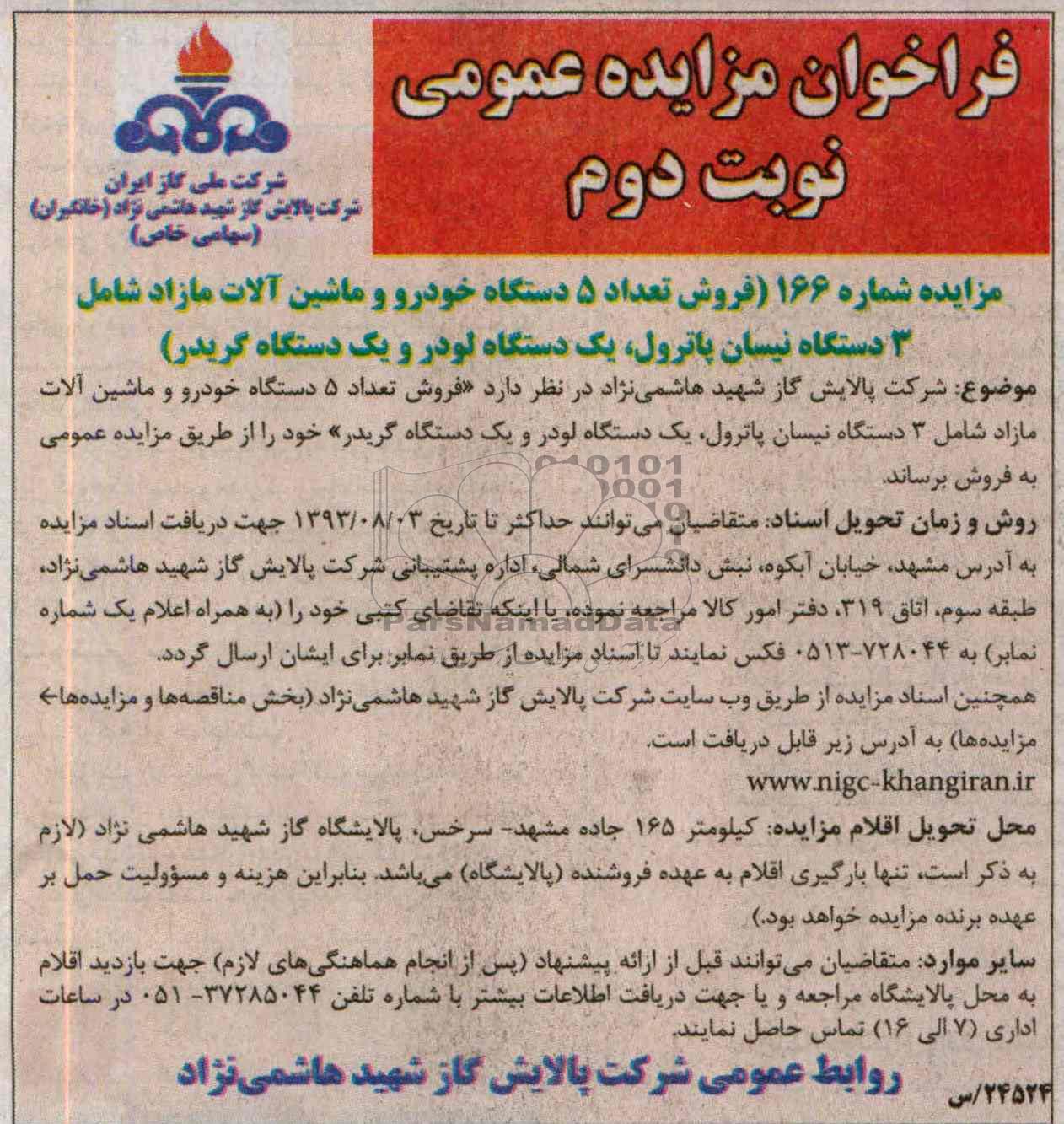 موضوع شرکت پالایش گاز شهید هاشمی نژاد در نظردارد فروش تعداد 5 دستگاه خودرو و ماشین آلات مازاد شامل 3 دستگاه نیسان پاترول یک دستگاه لودر و یک دستگاه گریدر خود را از طریق مزایده عمومی به فروش برساند