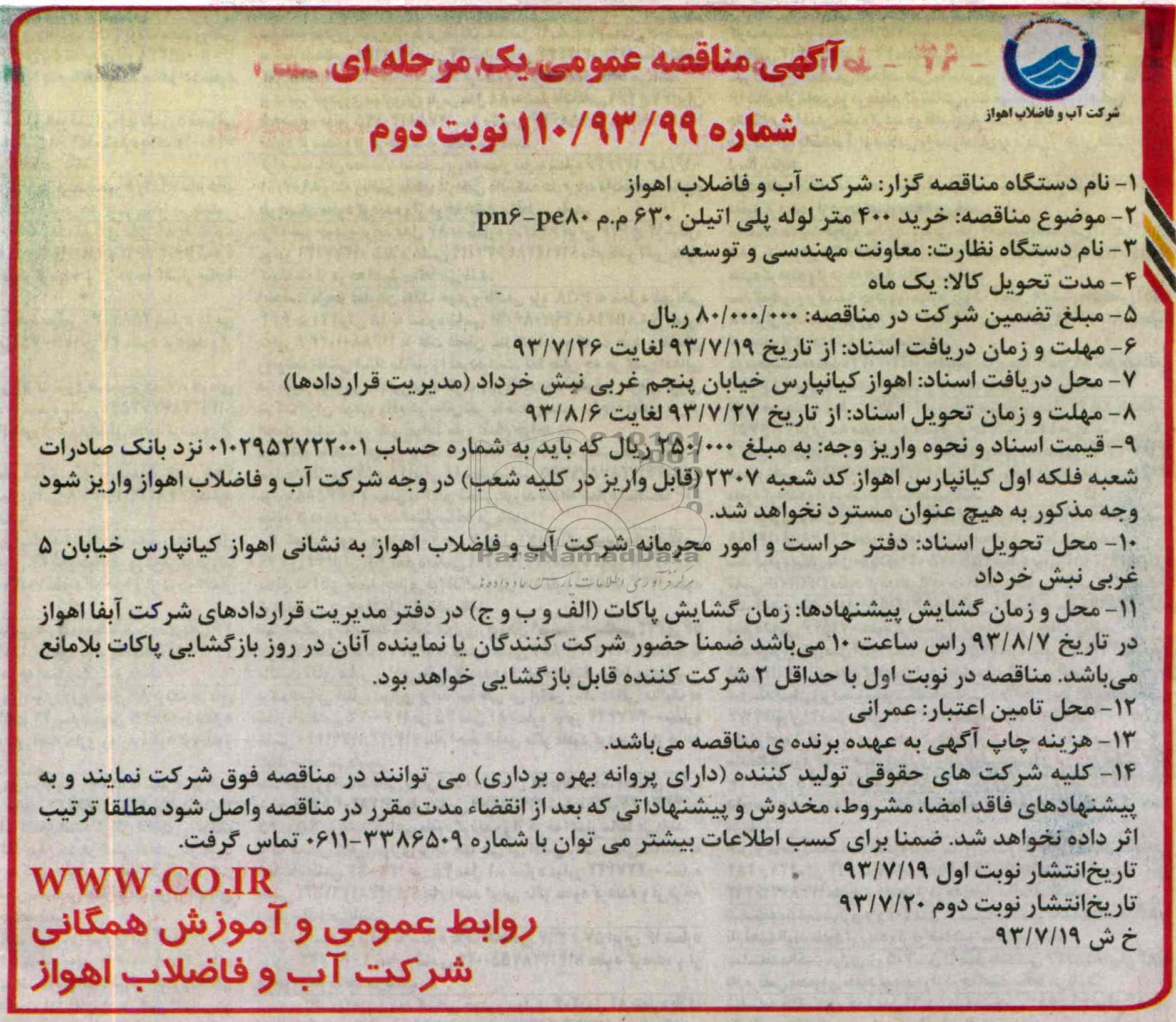 1- نام دستگاه مناقصه گذار: شرکت آب و فاضلاب اهواز