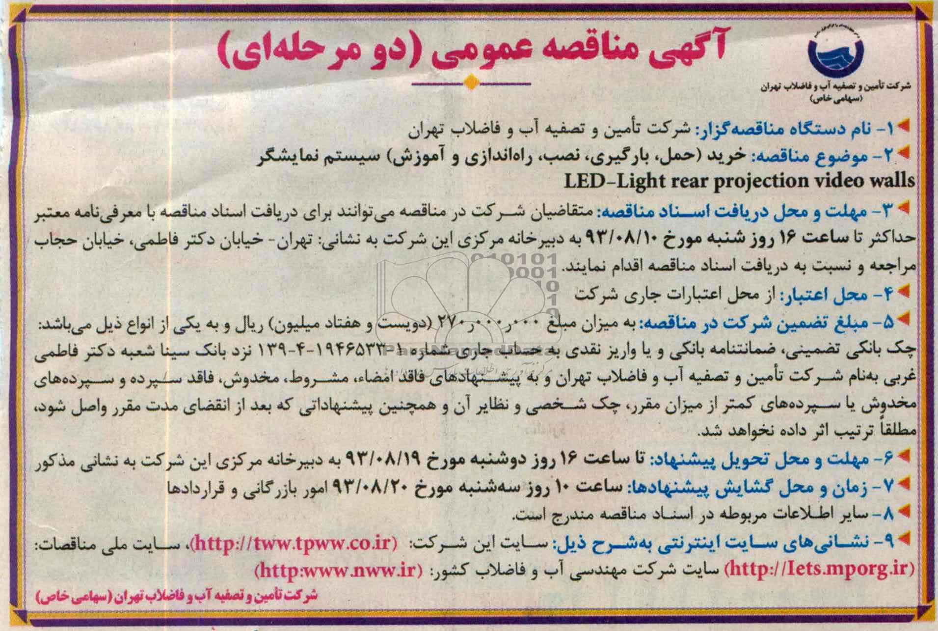 موضوع مناقصه: خرید (حمل ، بارگیری ، نصب ، راه اندازی و آموزش) سیستم نمایشگر