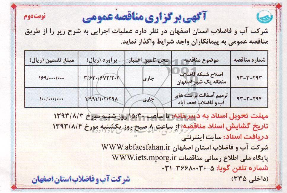 شرکت آب و فاضلاب استان اصفهان در نظر دارد عملیات اجرایی به شرح زیر را از طریق مناقصه عمومی به پیمانکاران واجد شرایط واگذار نماید