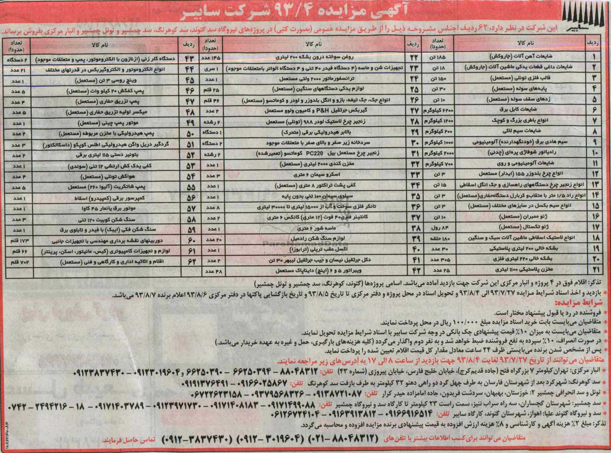 این شرکت در نظر دارد 62 ردیف اجناس مشروحه ذیل را از طریق مزایده عمومی به صورت کتبی در پروژه های نیروگاه سد گتوند، سد کوهرنگ، سد چمشیر و تونل چمشیر و انبار مرکزی بفروش برساند.