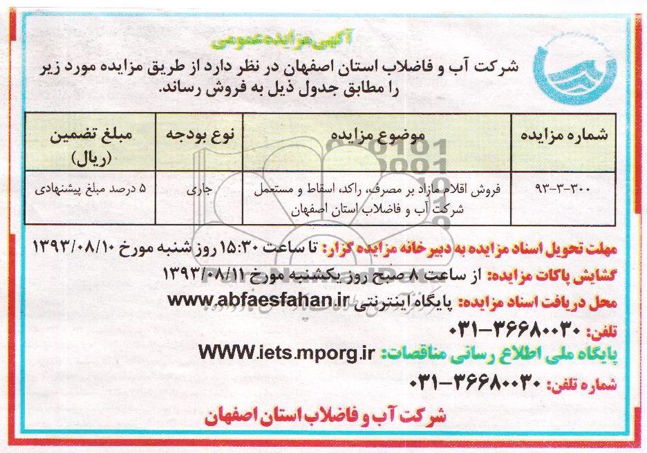 شرکت آب و فاضلاب استان اصفهان در نظر دارد از طریق مزایده مورد زیر را مطابق جدول ذیل به فروش رساند.