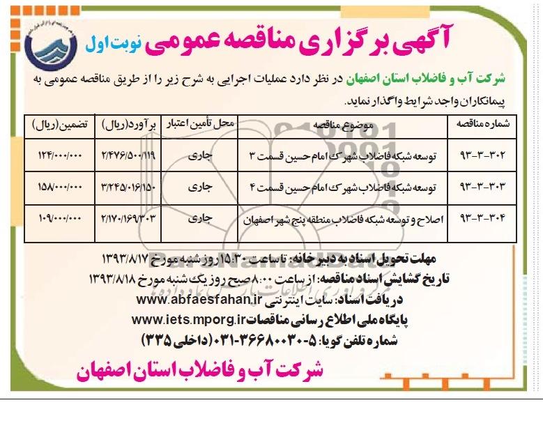 شرکت آب و فاضلاب استان اصفهان در نظر دارد عملیات اجرایی به شرح زیر را از طریق مناقصه عمومی به پیمانکاران واجد شرایط واگذار نماید
