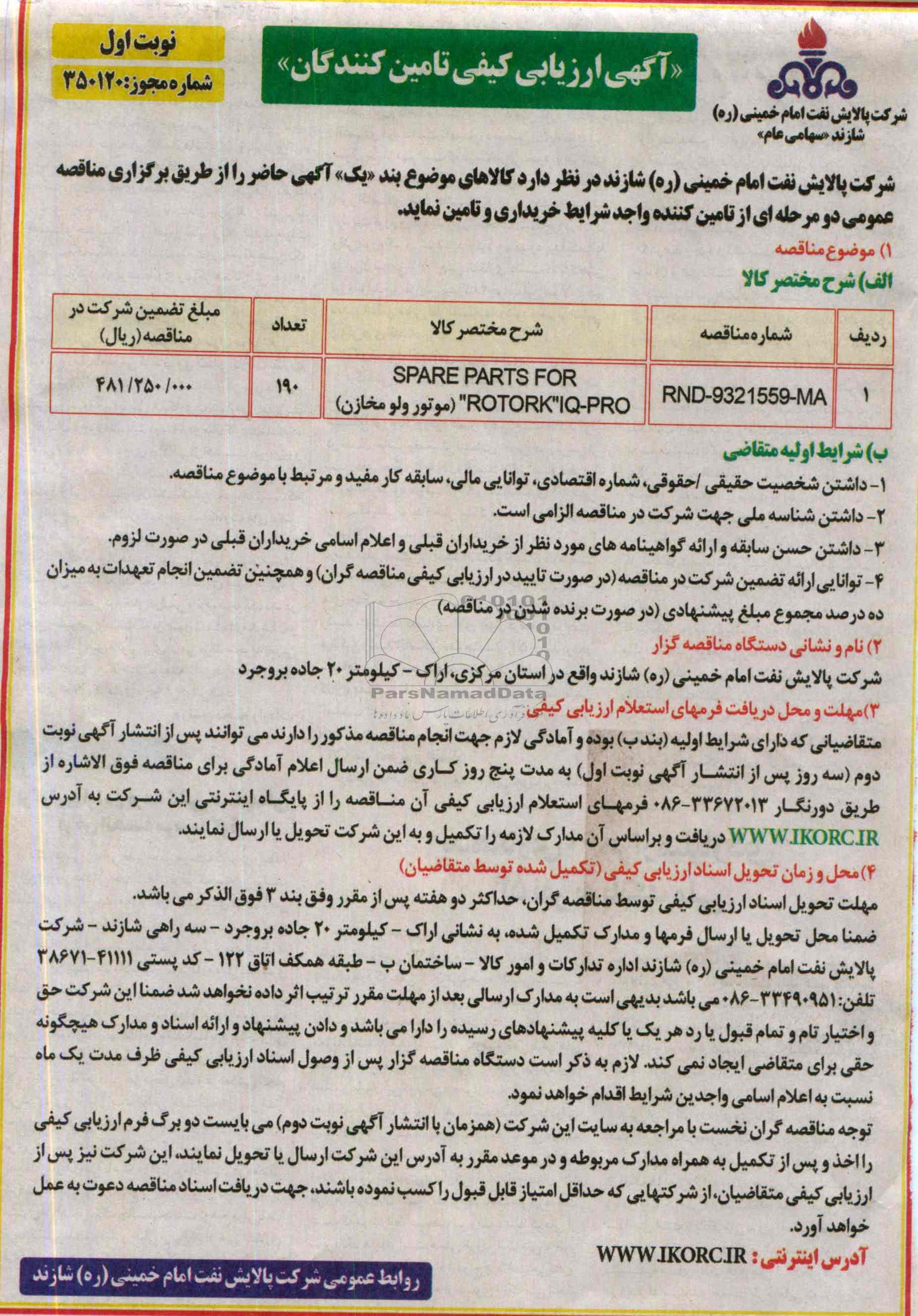 آگهی ارزیابی کیفی تامین کنندگان SPARE PARTS FOR ROTORK IQ-PRO موتور ولو مخازن از کلیه افراد متخصص و شرکتها واجد شرایط دعوت به عمل میآید در مناقصه با کد خبرگزاری پارس نماد: 395551 شرکت نمایند.