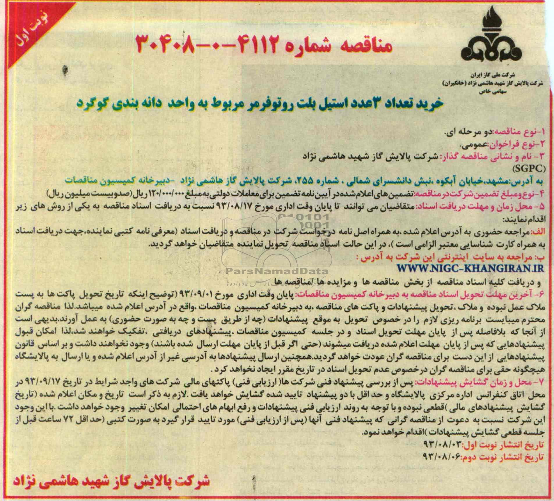 نام و نشانی مناقصه گذار: شرکت پالایش گاز شهید هاشمی نژاد SGPC