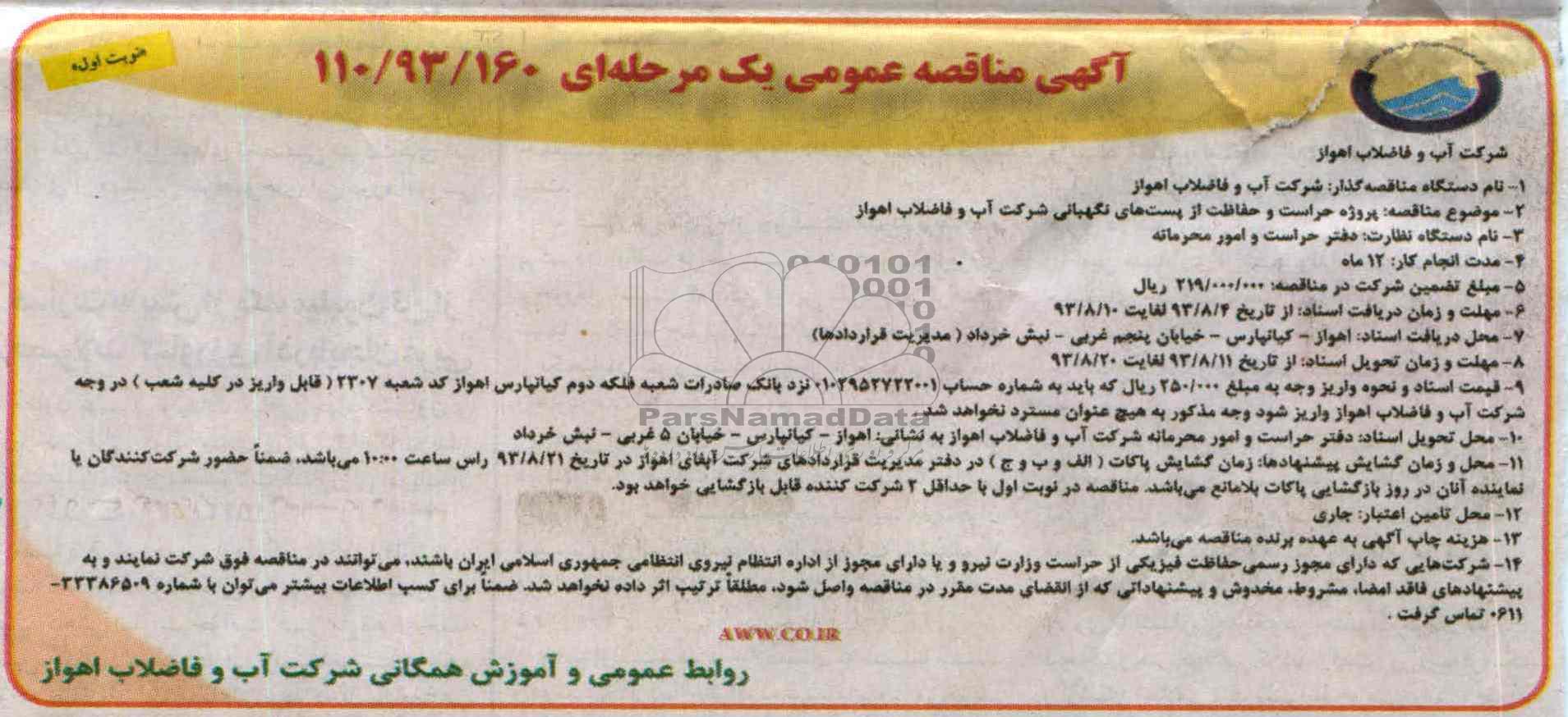 2- موضوع مناقصه :پروژه حراست و حفاظت از پست های نگهبانی شرکت آب و فاضلاب اهواز