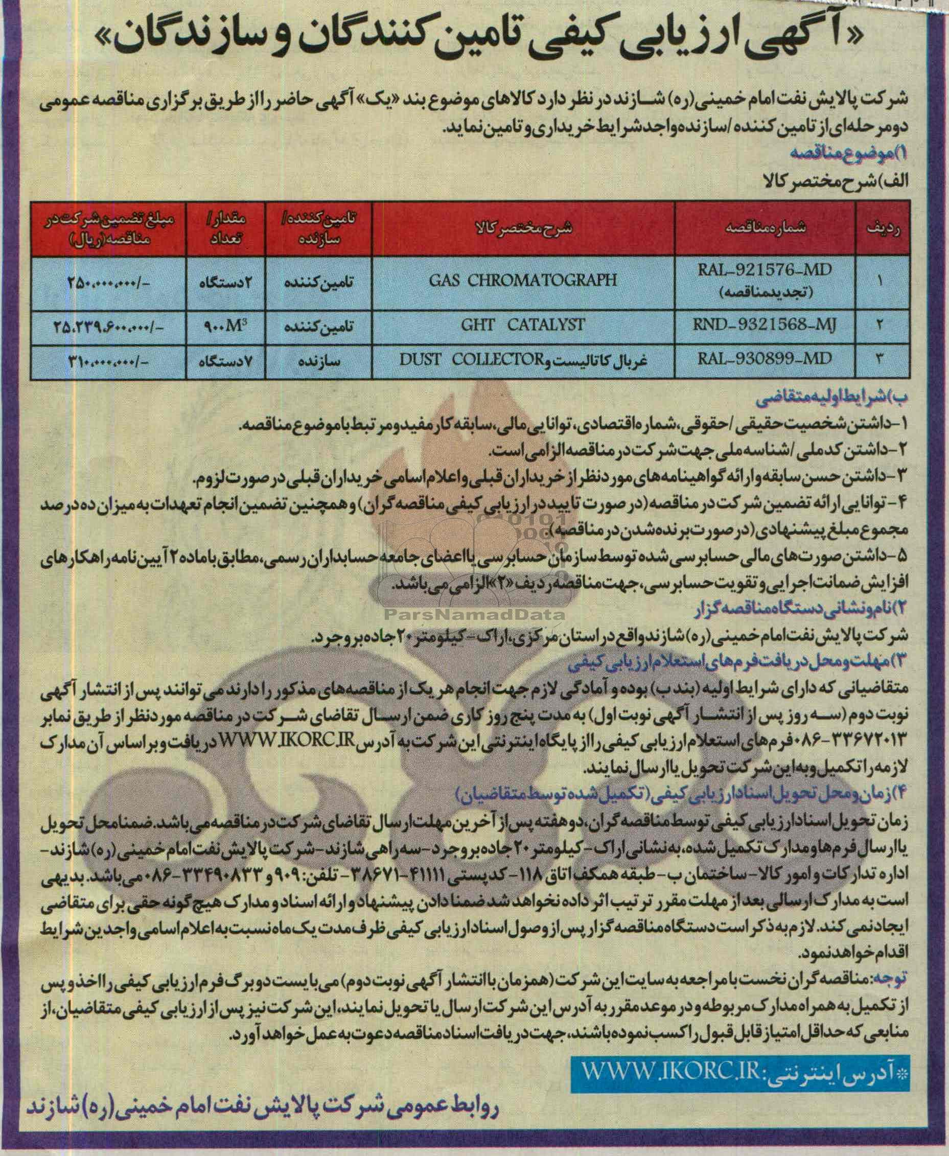 | 3 | RLA-930899-MD | غربال کاتالیست و DUST COLLECTOR | سازنده | 7 دستگاه | 310.000.000 |