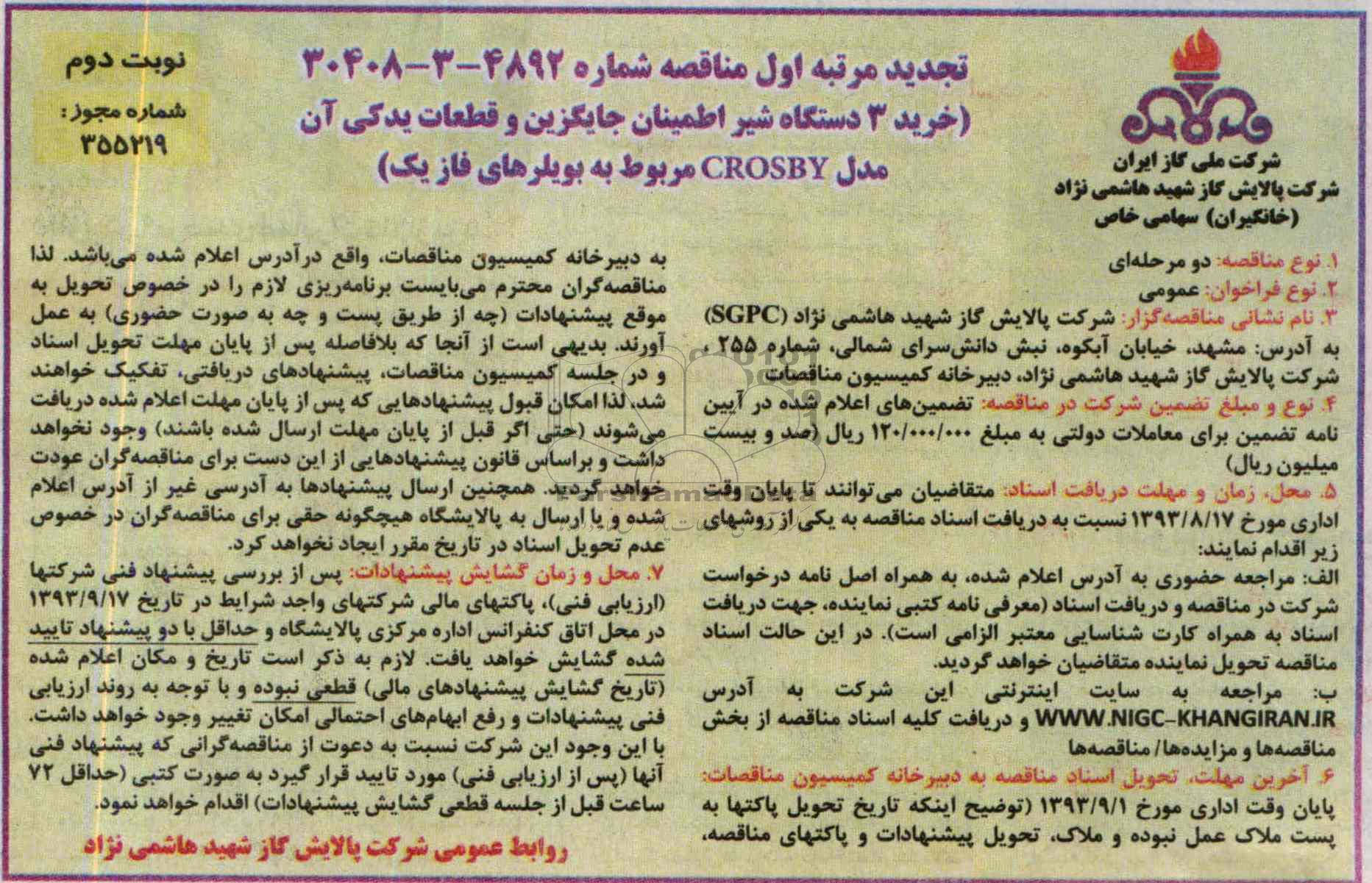 نام و نشانی مناقصه گذار: شرکت پالایش شهید هاشمی نژاد (SGPC) به آدرس: مشهد، خیابان آبکوه، نبش دانشسرای شمالی، شماره 255، شرکت پالایش گاز شهید هاشمی نژاد، دبیرخانه کمیسیون مناقصات