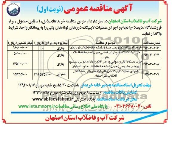 شرکت آب و فاضلاب استان اصفهان در نظر دارد از طریق مناقصه خریدهای ذیل را مطابق جدول زیر از فروشندگان ذیصلاح انجام و اجرای عملیات لاینینگ درزهای لوله های بتنی را به پیانکار واجد شرایط واگذار نماید.