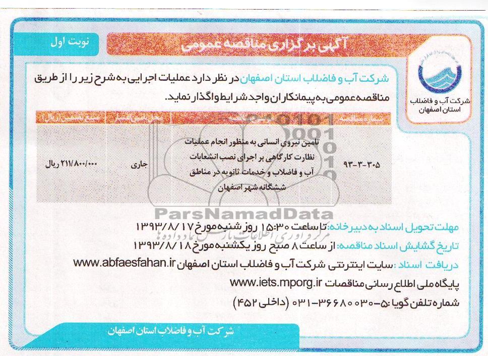 | 305-3-93 | تامین نیروی انسانی به منظور انجام عملیات نظارت کارگاهی بر اجرای نصب انشعابات آب و فاضلاب و خدمات ثانویه در مناطق ششگانه شهر اصفهان |
