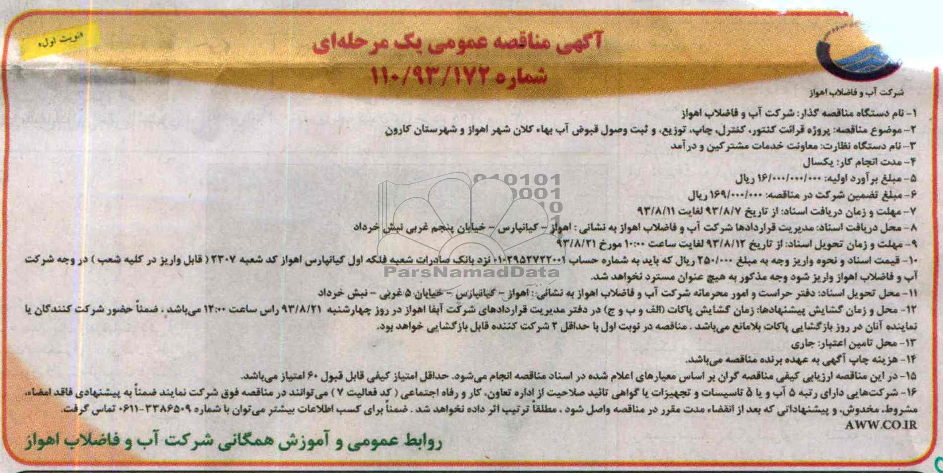 مناقصه پروژه قرائت کنتور، کنترل، چاپ، توزیع از کلیه افراد متخصص و شرکتها واجد شرایط دعوت به عمل میآید در مناقصه با کد خبرگزاری پارس نماد: 397291 شرکت نمایند.