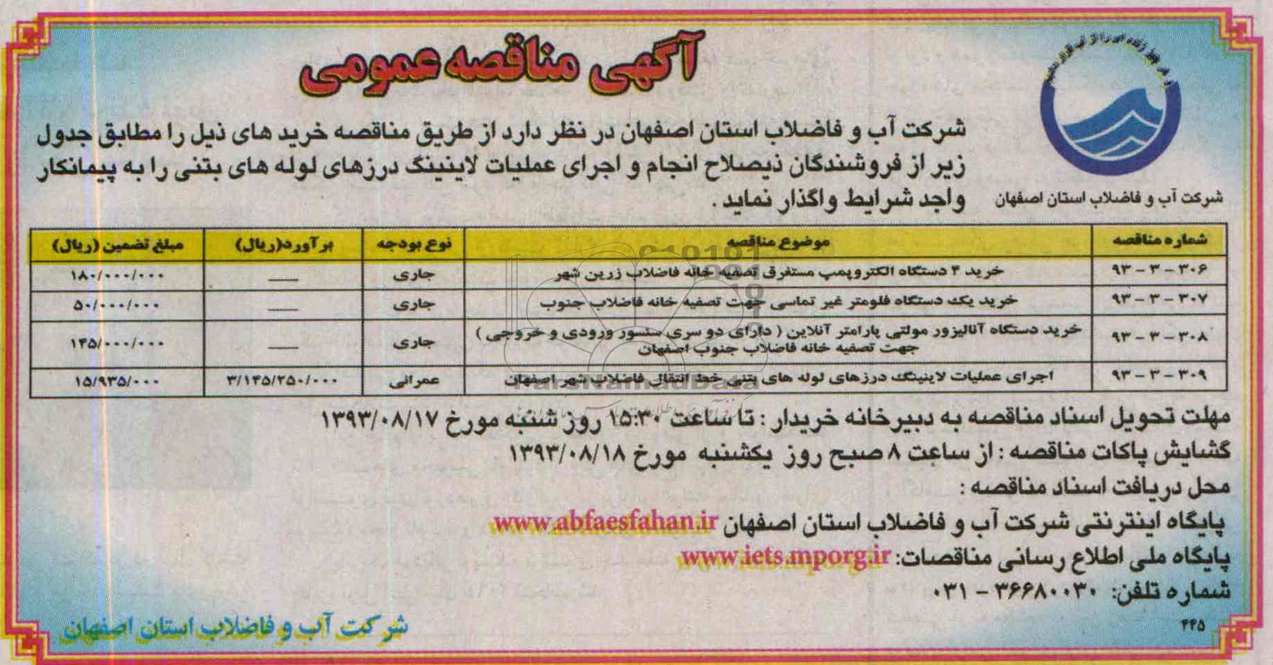 | 308-3-93 | خرید دستگاه آنالیزور مولتی پارامتر آنلاین (دارای دو سری سنسور ورودی و خروجی ) جهت تصفیه خانه فاضلاب جنوب اصفهان | جاری | - | 145.000.000 |