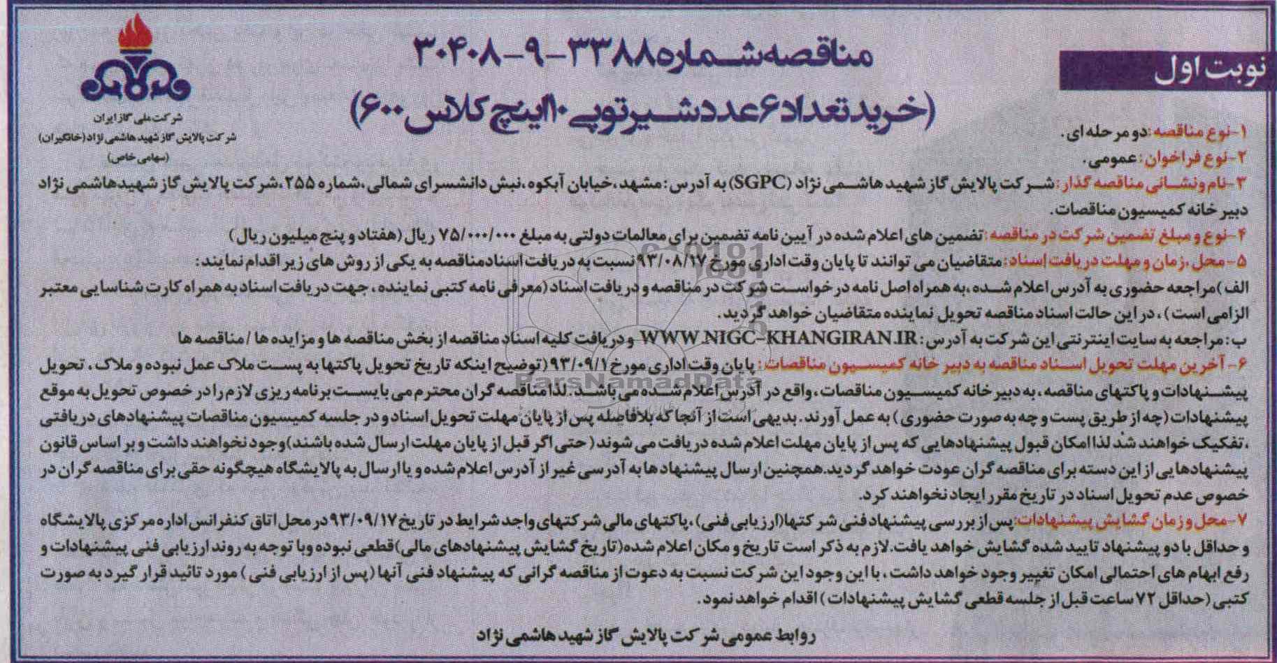 نام و نشانی مناقصه گزار شرکت پالایش گاز شهید هاشمی نژاد sgpc به ادرس مشهد خیابان آبکوه نبش دانشسرای شمالی شماره 255 شرکت پالایش گاز شهید هاشمی نژاد دبیرخانه کمیسیون مناقصات