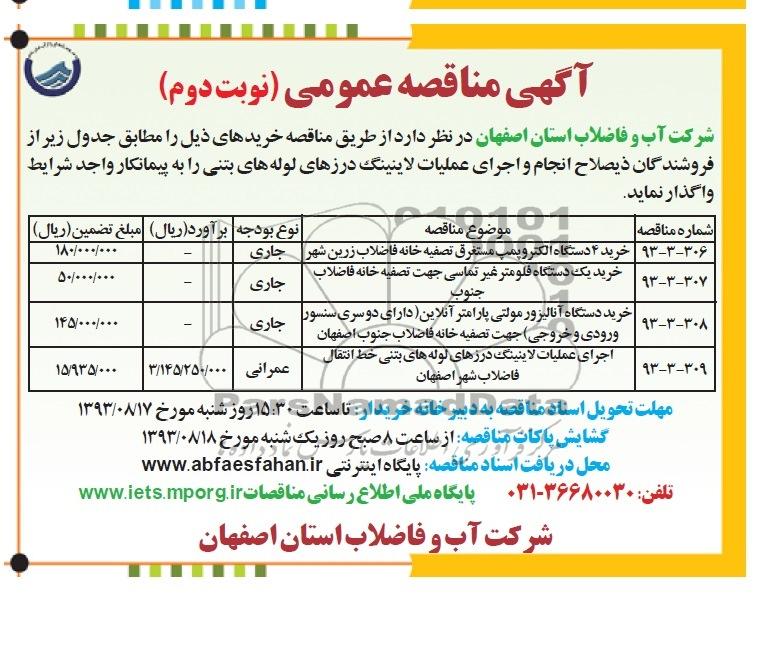 شرکت آب و فاضلاب استان اصفهان در نظر دارد از طریق مناقصه خریدهای ذیل را مطابق جدول زیر از فروشندگان ذیصلاح انجام و اجرای عملیات لاینینگ درزهای لوله های بتنی را به پیانکار واجد شرایط واگذار نماید.