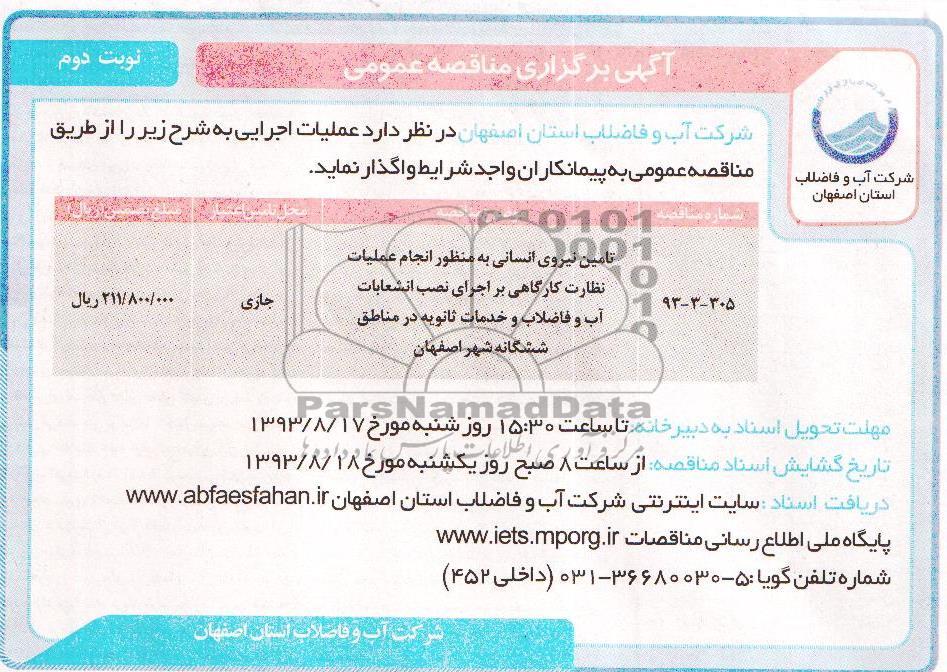 | 305-3-93 | تامین نیروی انسانی به منظور انجام عملیات نظارت کارگاهی بر اجرای نصب انشعابات آب و فاضلاب و خدمات ثانویه در مناطق ششگانه شهر اصفهان |