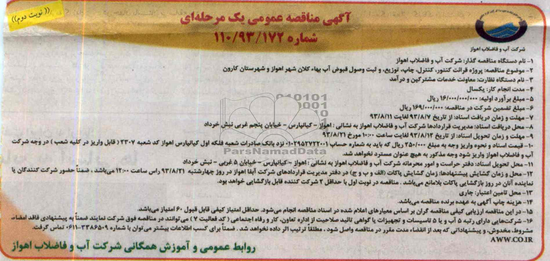 2- موضوع مناقصه :پروژه قرائت کنتور، کنترل، چاپ، توزیع، و ثبت وصول قبوض آب بهاء کلان شهر اهواز و شهرستان کارون
