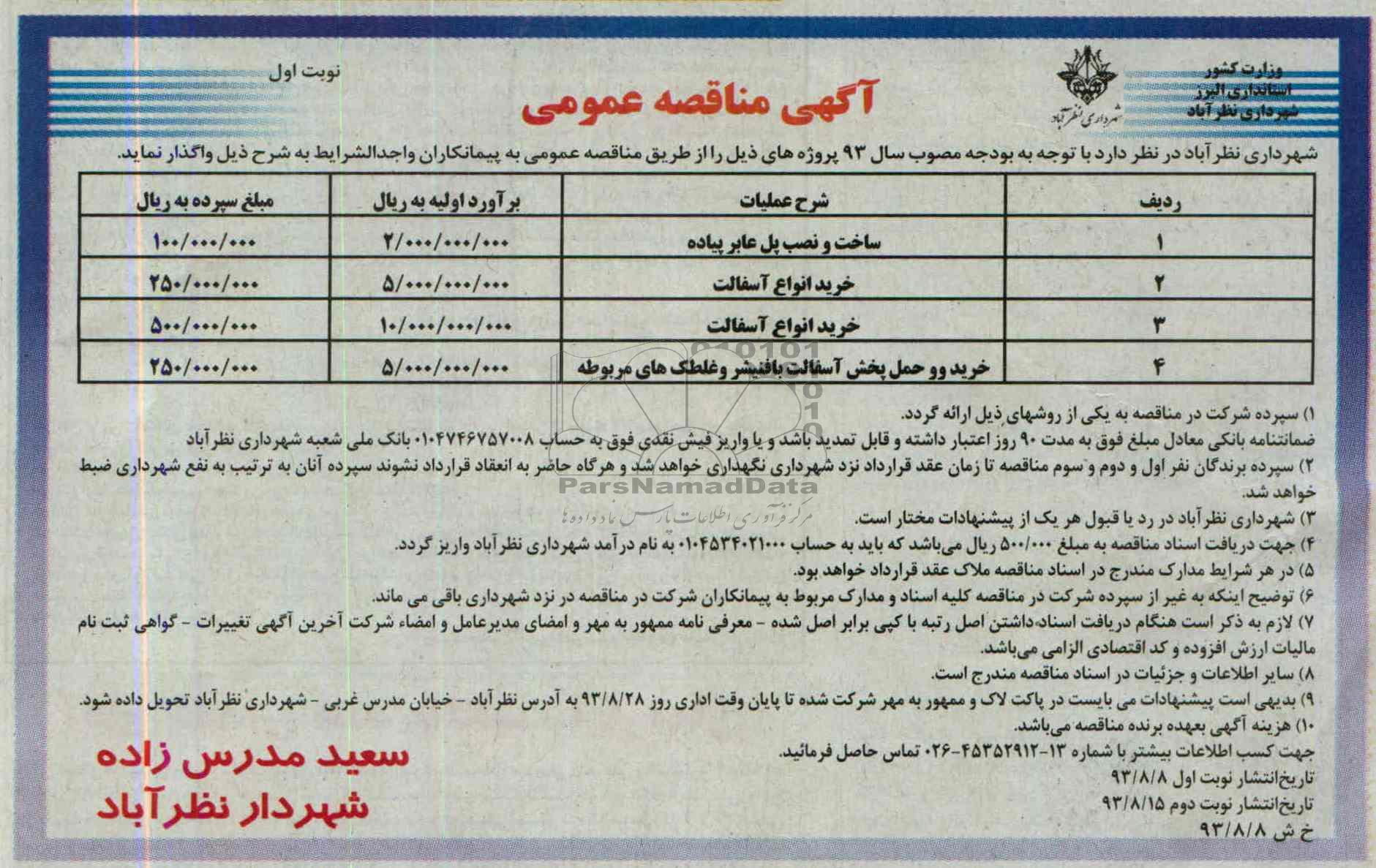 شهرداری نظرآباد در نظر دارد با توجه به بودجه مصوب سال 93 پروژه های ذیل را از طریق مناقصه عمومی به پیمانکاران واجد شرایط به شرح جدول ذیل واگذار نماید