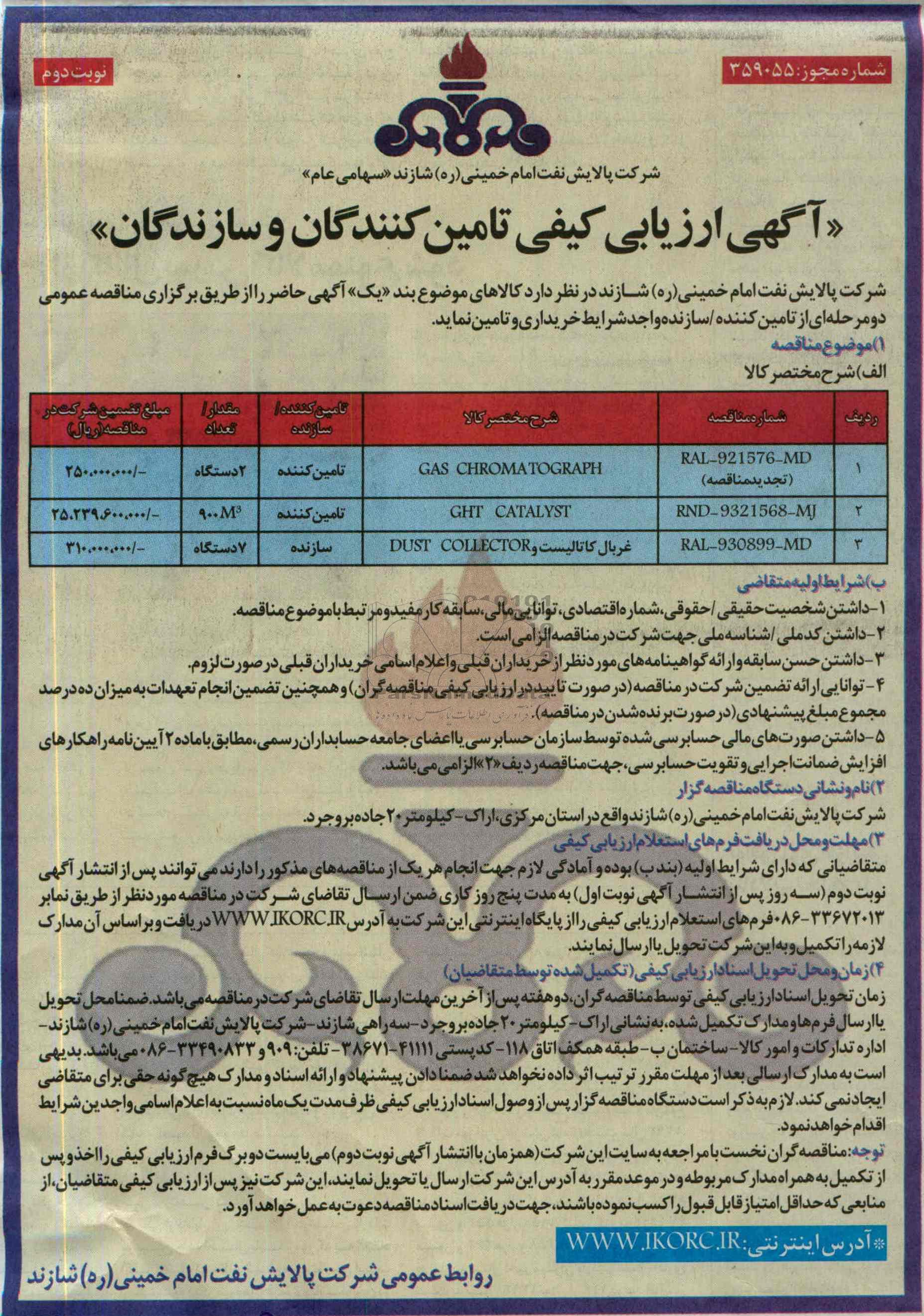 | 3 | RLA-930899-MD | غربال کاتالیست و DUST COLLECTOR | سازنده | 7 دستگاه | 310.000.000 |