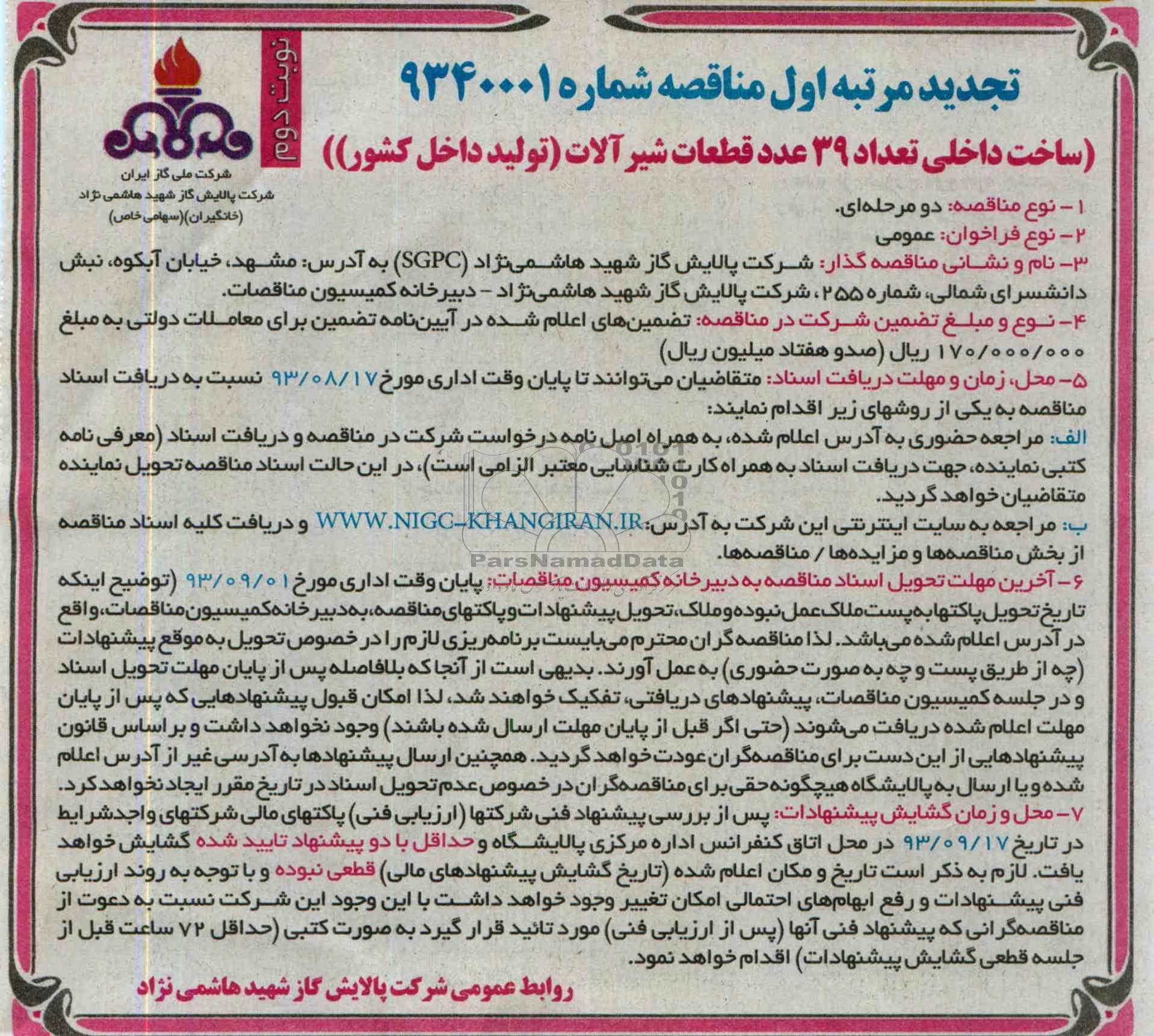 تجدید مناقصه ساخت داخلی تعداد 39 عدد قطعات شیر آلات از کلیه افراد متخصص و شرکتها واجد شرایط دعوت به عمل میآید در مناقصه با کد خبرگزاری پارس نماد: 398072 شرکت نمایند.
