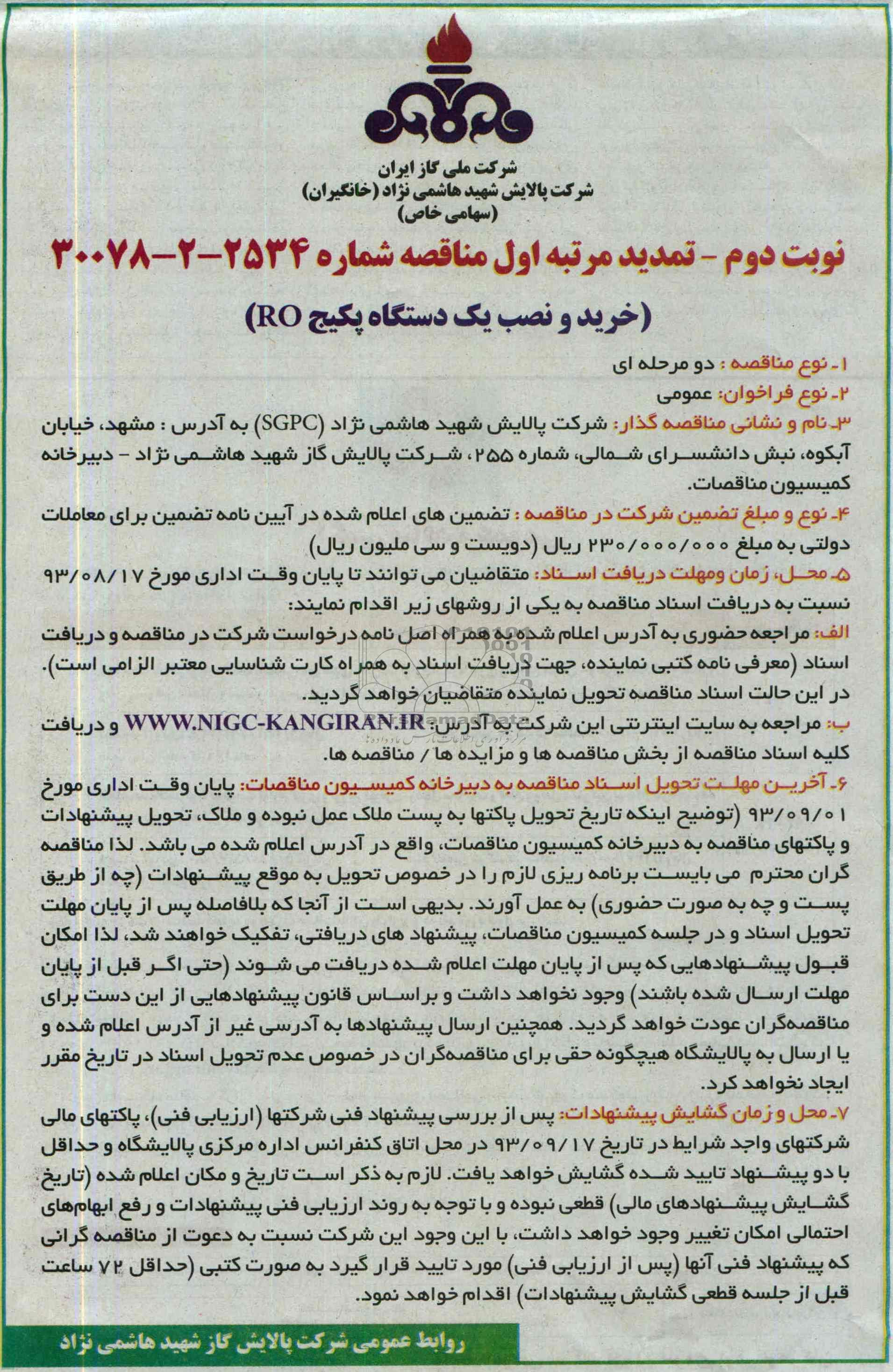 نام و نشانی مناقصه گذار: شرکت پالایش گاز شهید هاشمی نژاد SGPC