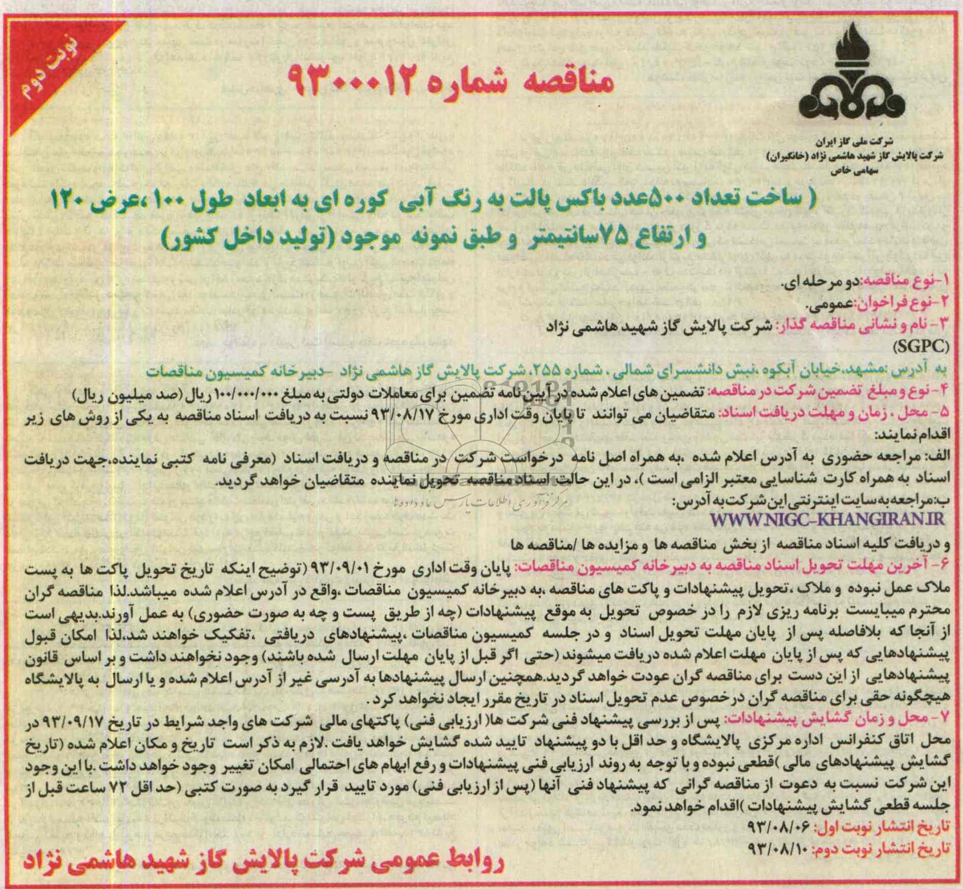 محل و زمان گشایش پیشنهادات: پس از بررسی پیشنهاد فنی شرکتها (ارزیابی فنی) پاکتهای مالی شرکتهای واجد شرایط در تاریخ 93.9.17 در محل اتاق کنفرانس اداره مرکزی پالایشگاه و حداقل با دو پیشنهاد تایید شده گشایش خواهد یافت لازم به ذکر است تا تاریخ و مکان اعلام شده (تاریخ گشایش پیشنهادهای مالی) قطعی نبوده و با توجه به روند ارزیابی فنی پیشنهادات و رفع ابهام های احتمالی امکان تغییر وجود خواهد داشت با این وجود این شرکت نسبت به دعوت از مناقصه گرانی که پیشنهاد فنی آنها پس از ارزیابی فنی مورد تایید قرار گیرد به صورت کتبی حداقل 72 ساعت قبل از جلسه قطعی گشایش پیشنهادات اقدام خواهد نمود