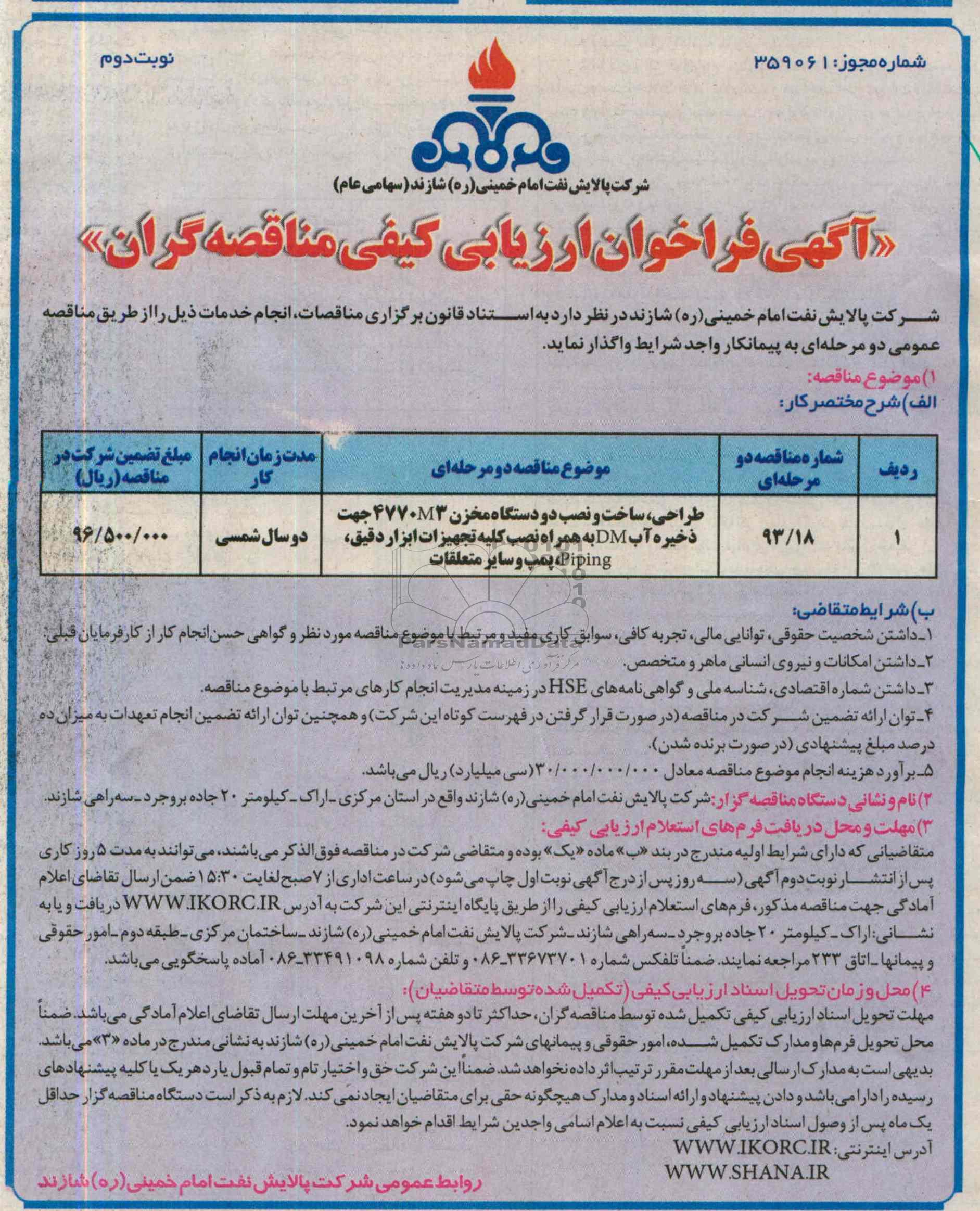 موضوع مناقصه دو مرحله ای: طراحی، ساخت و نصب دو دستگاه مخزن 4770M3 جهت ذخیره آب DM به همراه نصب کلیه تجهیزات ابزار دقیق، PIPING پمپ و سایر متعلقات