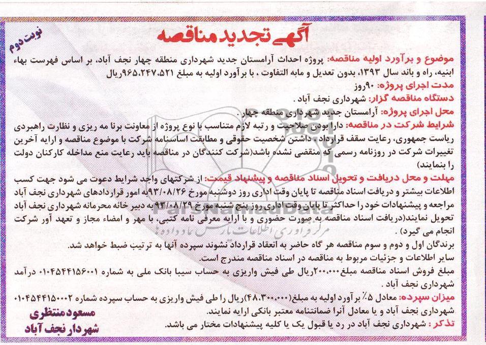 موضوع و برآورد اولیه مناقصه: پروژه احداث آرامستان جدید شهرداری منطقه چهار نجف آباد براساس فهرست بهاء ابنیه ، راه و باند سال 1393 بدون تعدیل و مابه التفاوت با برآورد اولیه به مبلغ 965.247.521 ریال