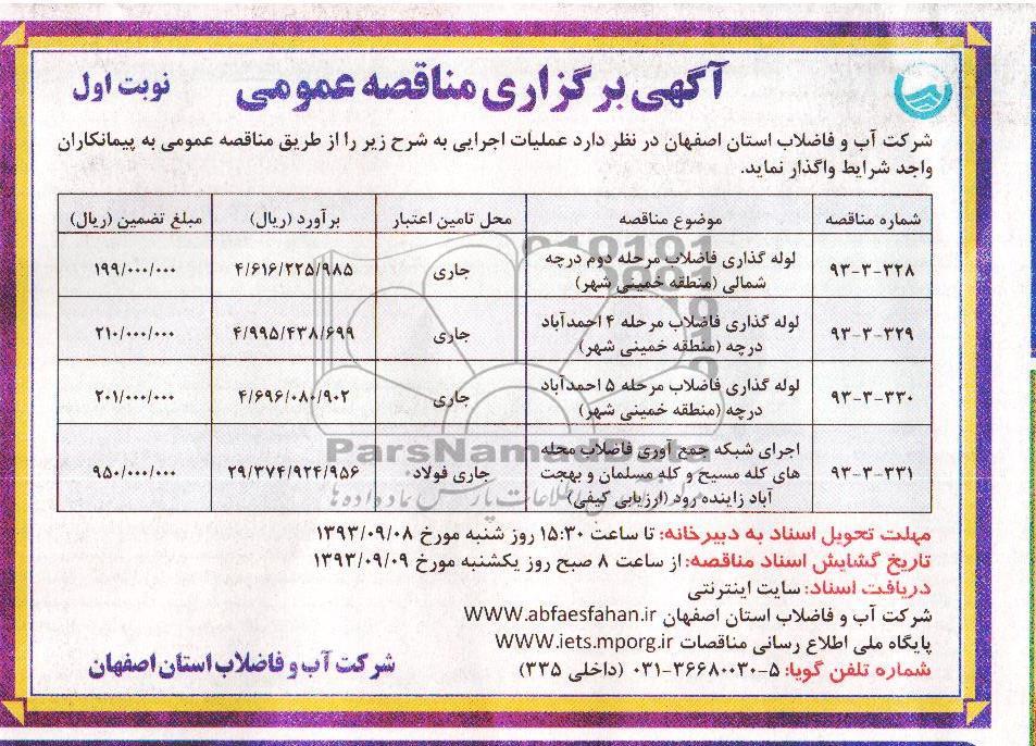 | 331-3-93 | اجرای شبکه جمع آوری فاضلاب محله های کله مسیح و کله مسلمان و بهجت آباد زاینده رود (ارزیابی کیفی 9 |