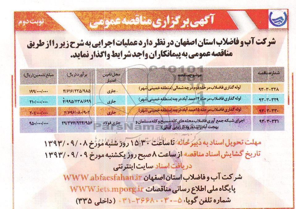 شرکت آب و فاضلاب استان اصفهان درنظردارد عملیات اجرایی به شرح زیر را از طریق مناقصه عمومی به پیمانکاران واجد شرایط واگذار نماید