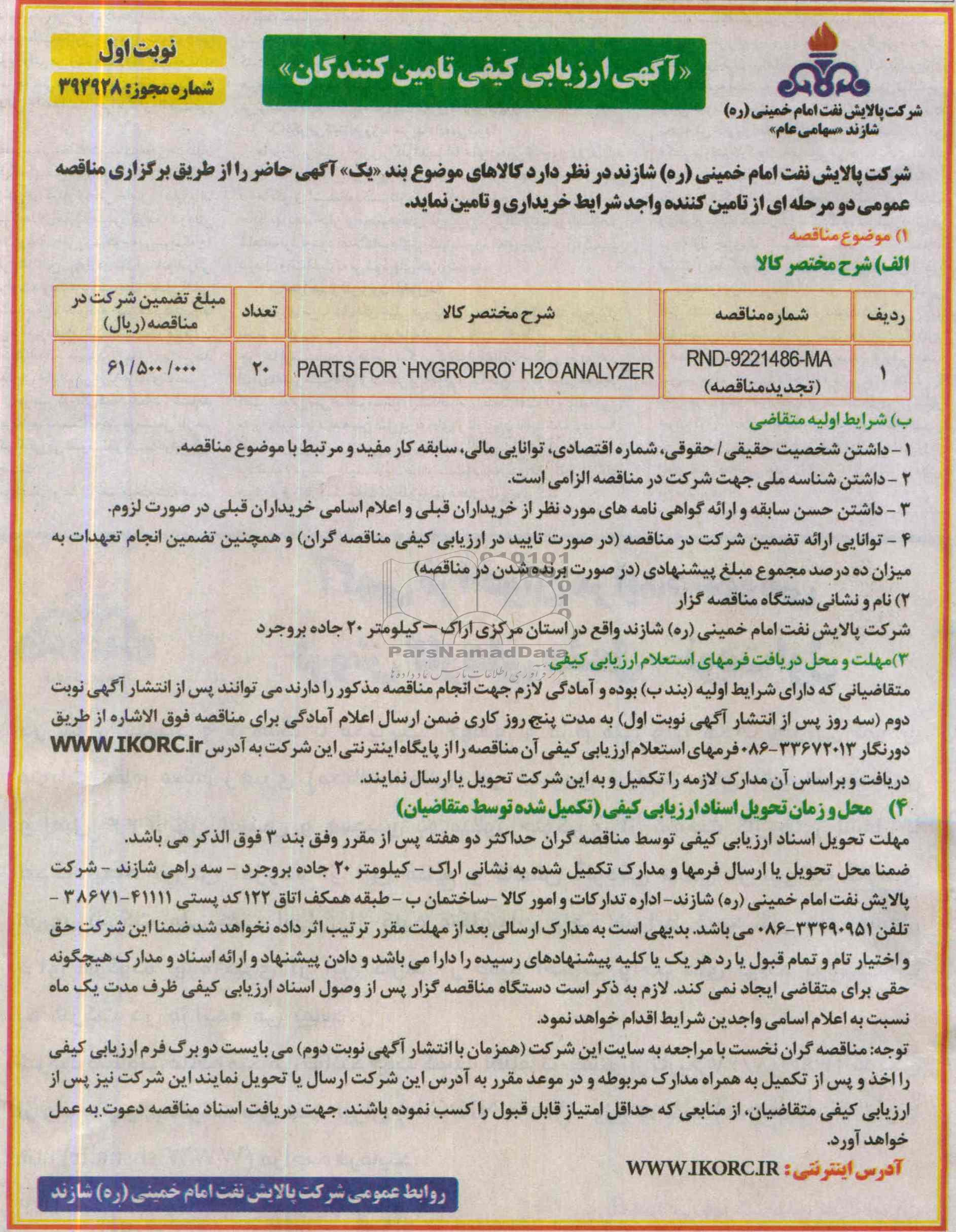 متقاضیانی که دارای شرایط اولیه بند ب بوده و آمادگی لازم جهت انجام مناقصه مذکور را دارند می توانند پس از انتشار آگهی نوبت دوم (سه روز پس از انتشار آگهی نوبت اول) به مدت پنج روز کاری ضمن ارسال اعلام آمادگی برای مناقصه فوق الاشاره از طریق دورنگار 33672013-086 فرمهای استعلام ارزیابی کیفی آن مناقصه را از پایگاه اینترنتی این شرکت به آدرس WWW.IKORC.IR دریافت و براساس آن مدارک لازمه را تکمیل و به این شرکت تحویل یا ارسال نمایند.