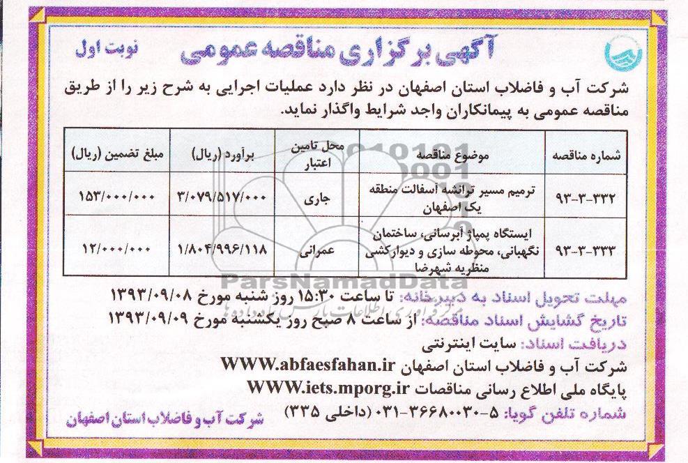 | 93-3-332 | ترمیم مسیر ترانشه آسفالت منطقه یک اصفهان | جاری | 3.079.517.000 | 153.000.000 |