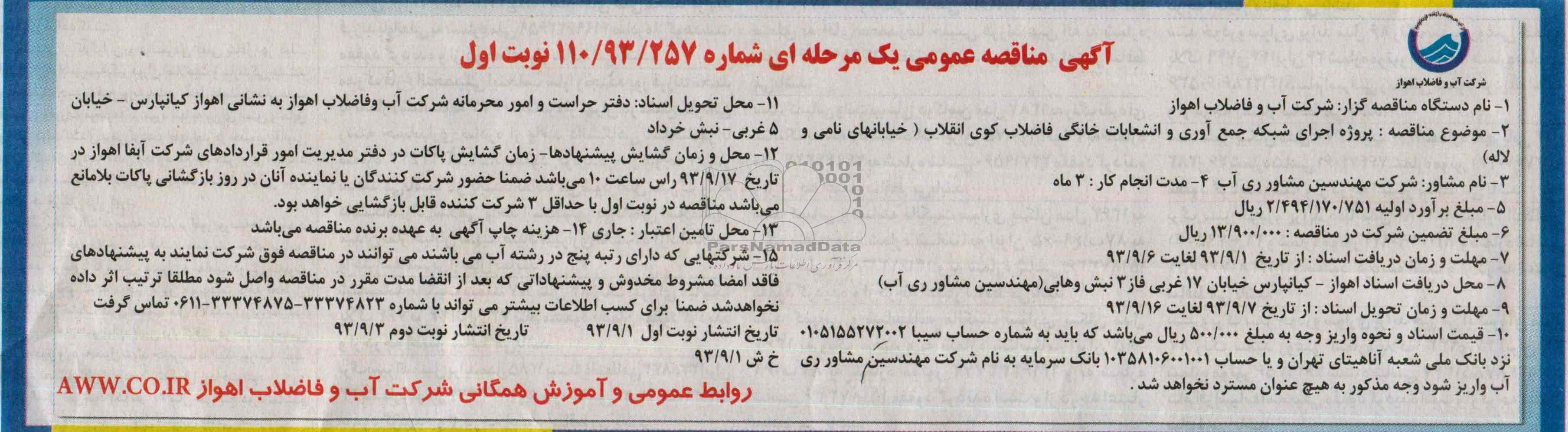 محل دریافت اسناد اهواز کیانپارس خیابان 17غربی فاز 3 نبش وهابی مهندسین مشاور ری اب
