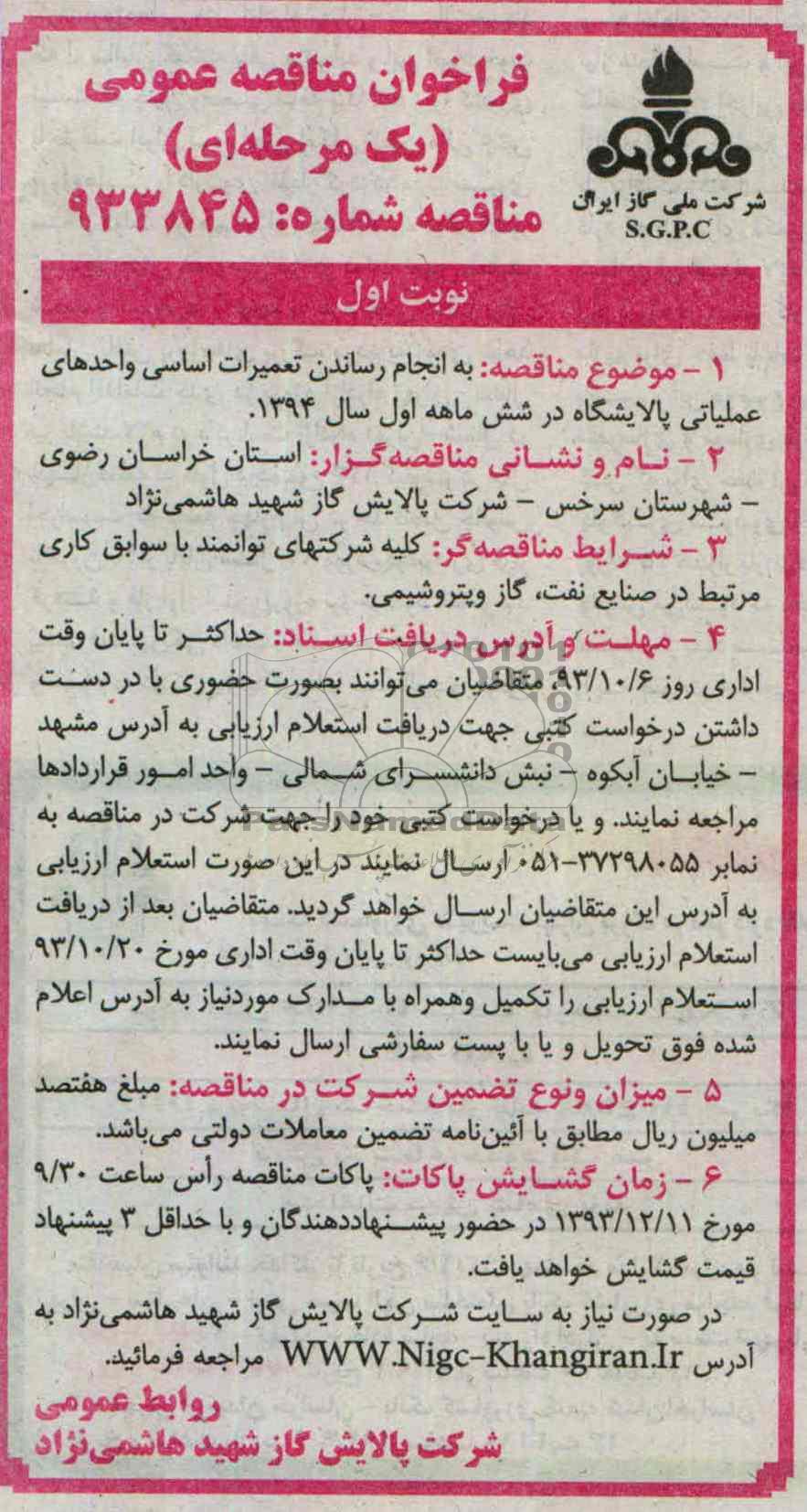 نام و نشانی مناقصه گزار : استان خراسان رضوی - شهرستان سرخس - شرکت پالایش گاز شهید هاشمی نژاد
