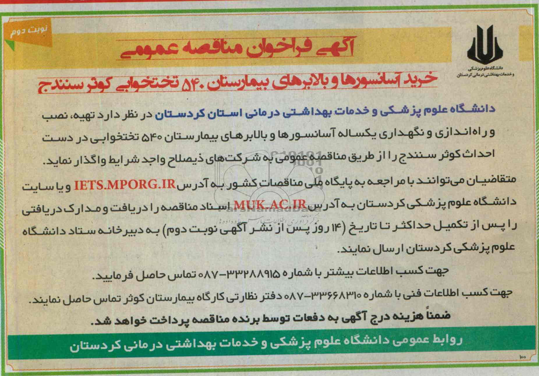 دانشگاه علوم پزشکی و خدمات بهداشتی درمانی استان کردستان در نظر دارد تهیه ، نصب و راه اندازی و نگهداری یکساله اسانسور ها و بالابرهای بیمارستان 540 تختخوابی در دست احداث کوثر سنندج را از طریق مناقصه عمومی به شرکت های ذیصلاح واجد شرایط واگذار نماید.