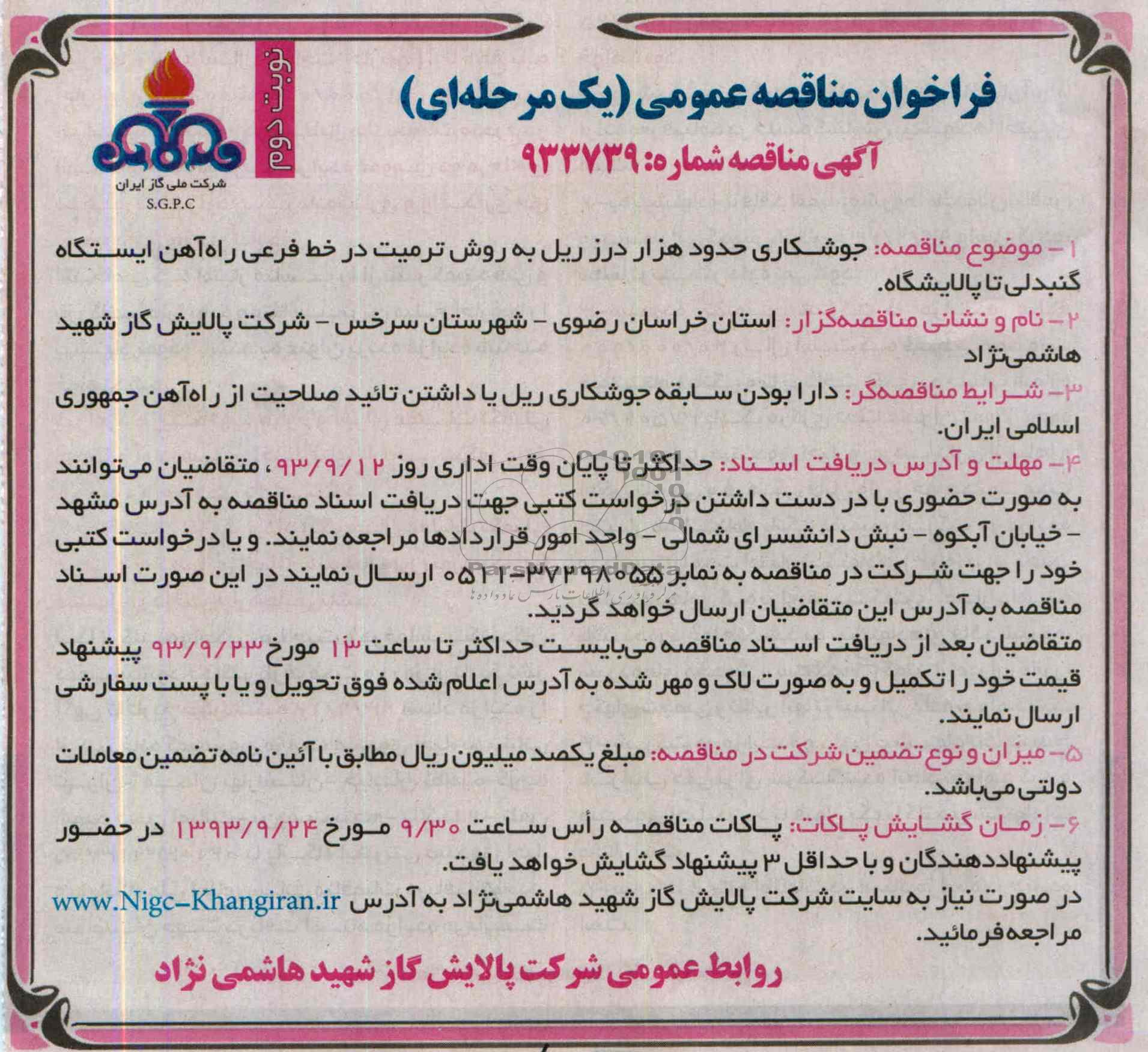 نام و نشانی مناقصه گزار: استان خراسان رضوی- شهرستان سرخس- شرکت پالایش گاز شهید هاشمی نژاد