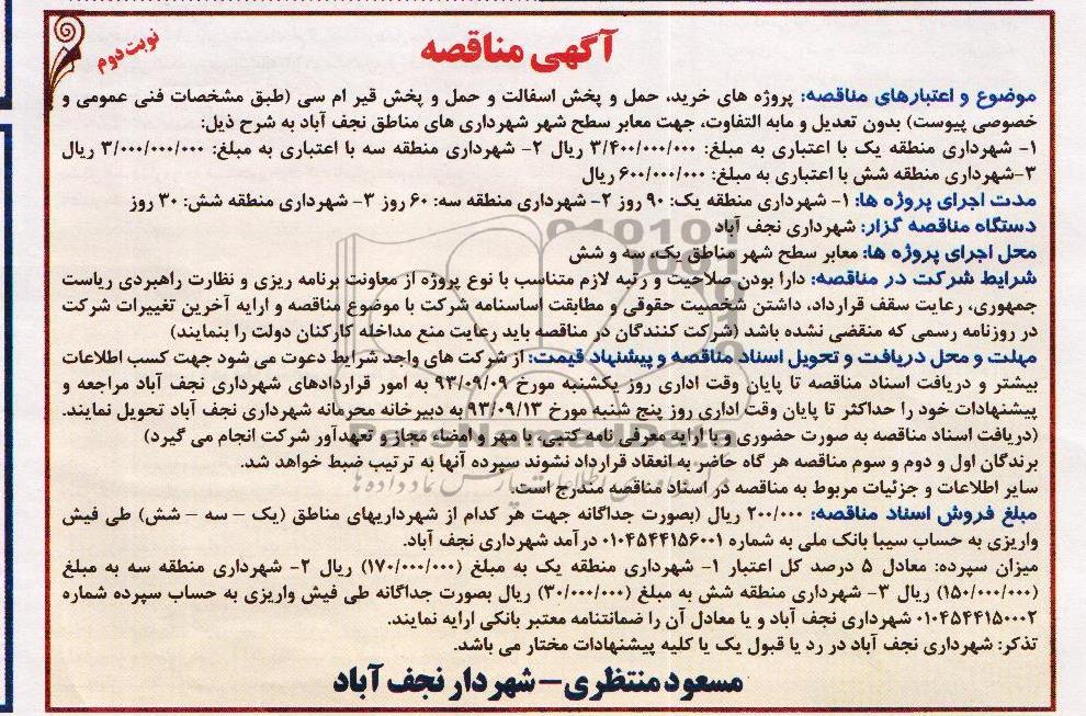 موضوع و اعتبارهای مناقصه: پروژه های خرید ، حمل و پخش آسفالت و حمل و پخش قیر ام سی (طبق مشخصات فنی عمومی و خصوصی پیوست) بدون تعدیل و مابه التفاوت ، جهت معابر سطح شهر شهرداری های مناطق نجف آباد به شرح ذیل