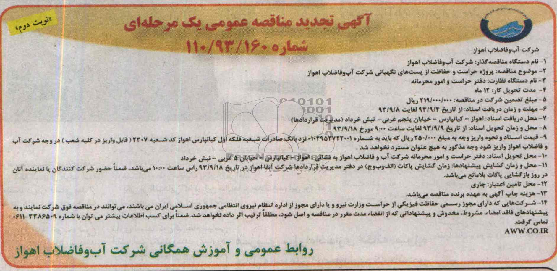 2- موضوع مناقصه :پروژه حراست و حفاظت از پست های نگهبانی شرکت آب و فاضلاب اهواز