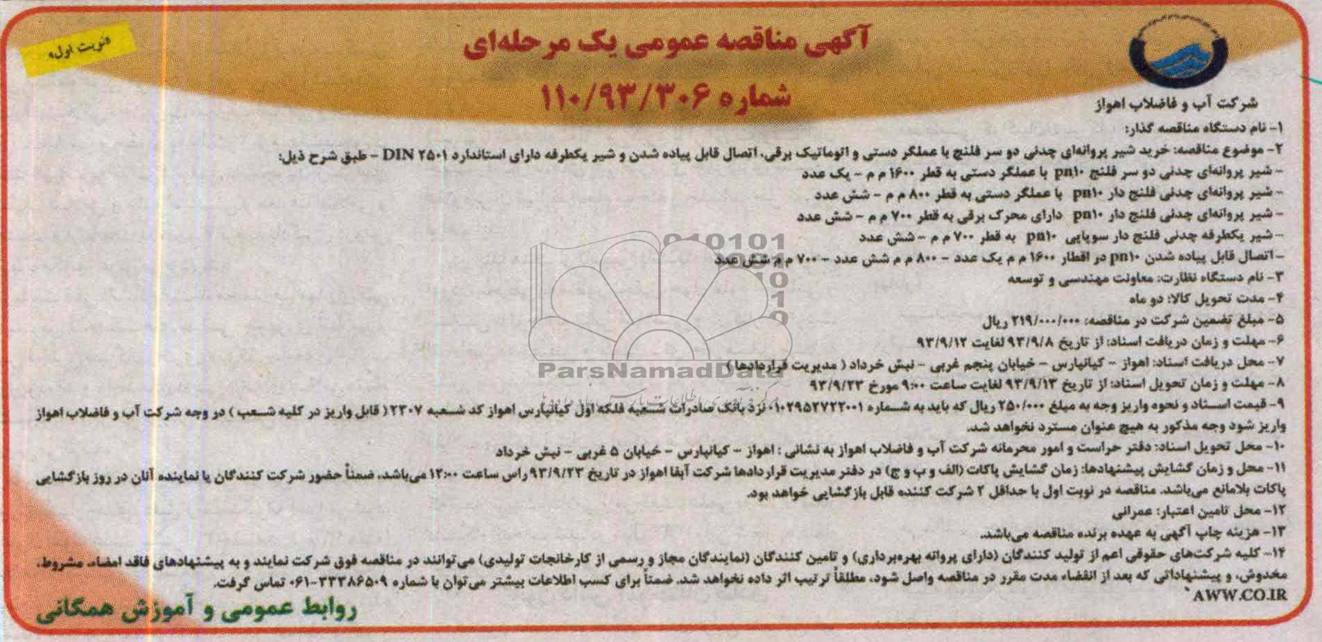 محل و زمان گشایش پیشنهادها: زمان گشایش پاکات (الف و ب و ج) در دفتر مدیریت قراردادها شرکت آبفا اهواز در تاریخ 93.9.23 راس ساعت 12 می باشد. ضمنا حضور شرکت کنندگان یا نماینده آنان در روز بازگشایی پاکات بلامانع می باشد. مناقصه در نوبت اول با حداقل 2 شرکت کننده قابل بازگشایی خواهد بود.