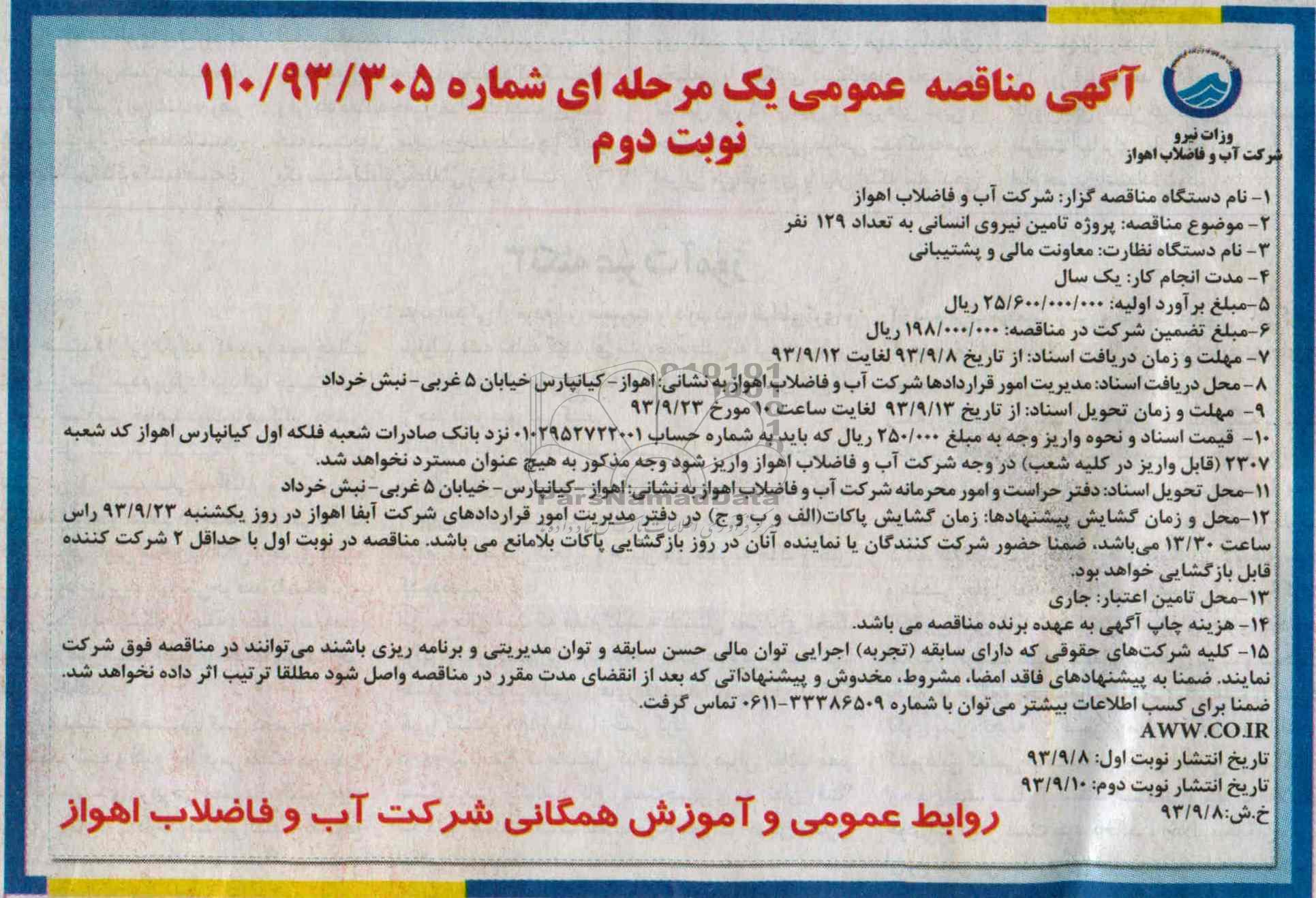 2- موضوع مناقصه : پروژه تامین نیروی انسانی به تعداد 129 نفر