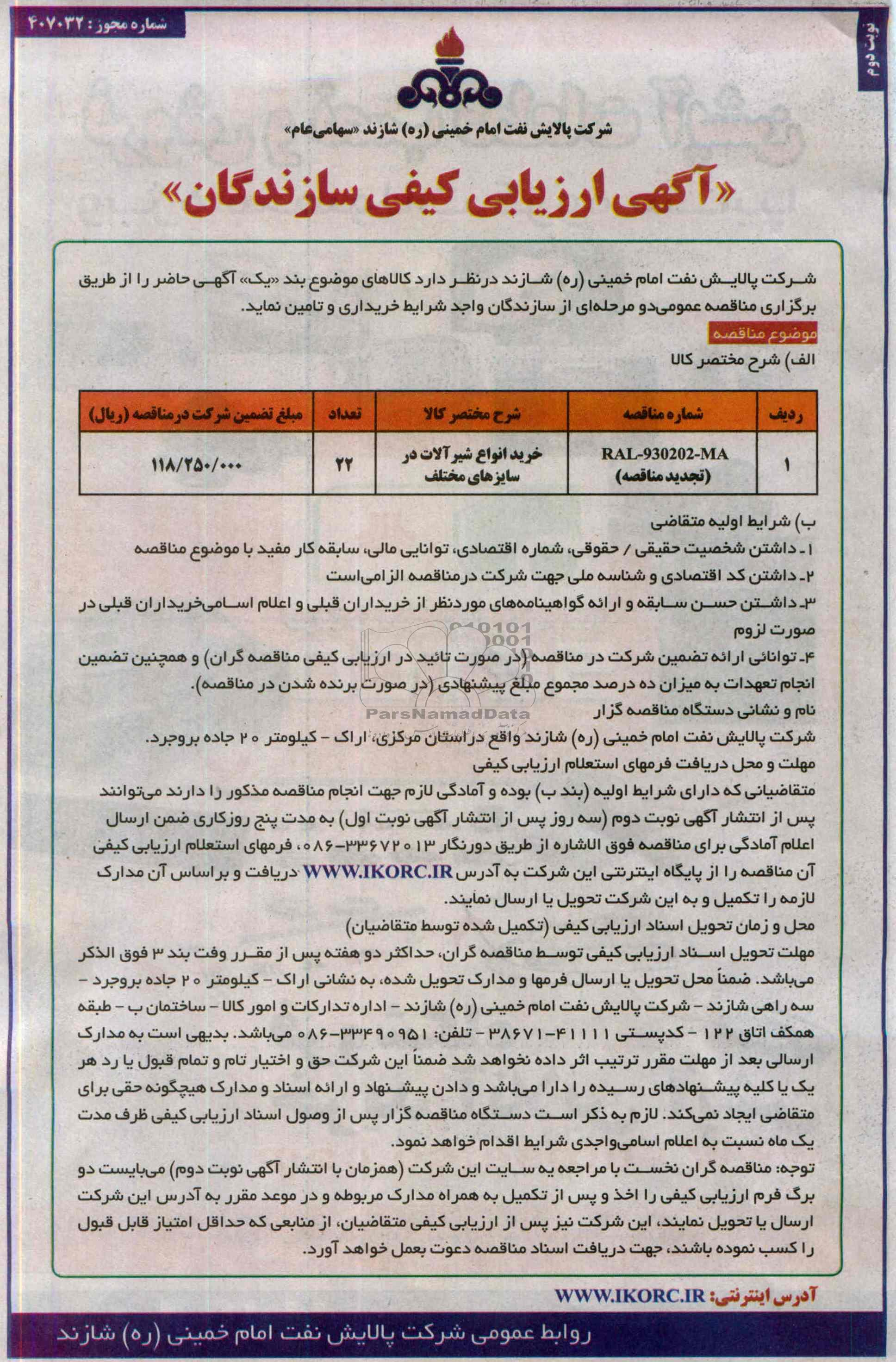 ارزیابی کیفی مناقصه خرید انواع شیرآلات در سایزهای مختلف از کلیه افراد متخصص و شرکتها واجد شرایط دعوت به عمل میآید در مناقصه با کد خبرگزاری پارس نماد: 409624 شرکت نمایند.