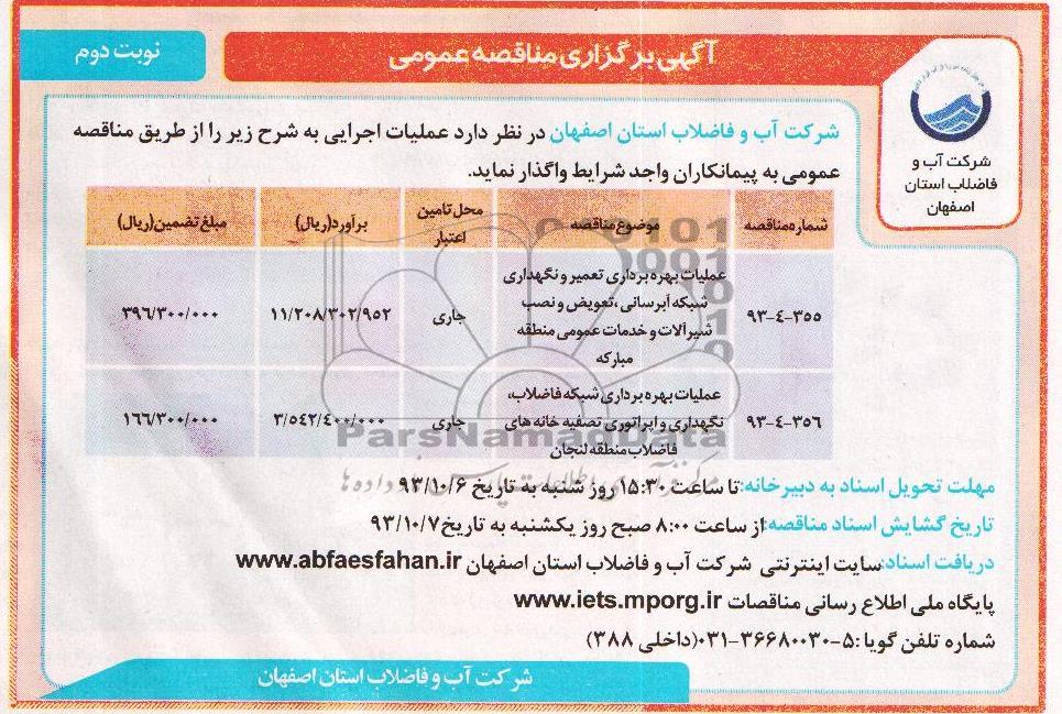 | 356-4-93 | عملیات بهره برداری شبکه فاضلاب نگهداری و اپراتوری تصفیه خانه های فاضلاب منطقه لنجان | جاری | 3.542.400.000 | 166.300.000 |