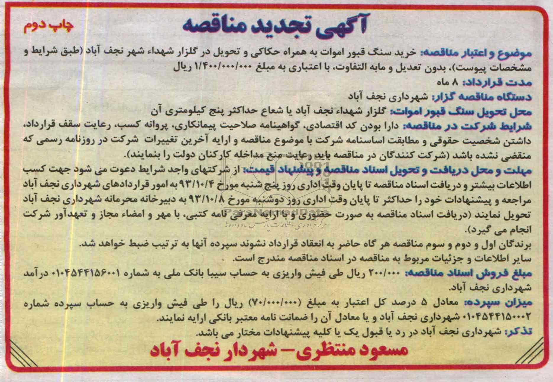 موضوع و اعتبار مناقصه:خرید سنگ قبور اموات به همراه حکاکی و تحویل در گلزار شهدا شهر نجف آباد (طبق شرایط و مشخصات پیوست) بدون تعدیل و مابه التفاوت، با اعتبارب به مبلغ 1.400.000.000 ریال