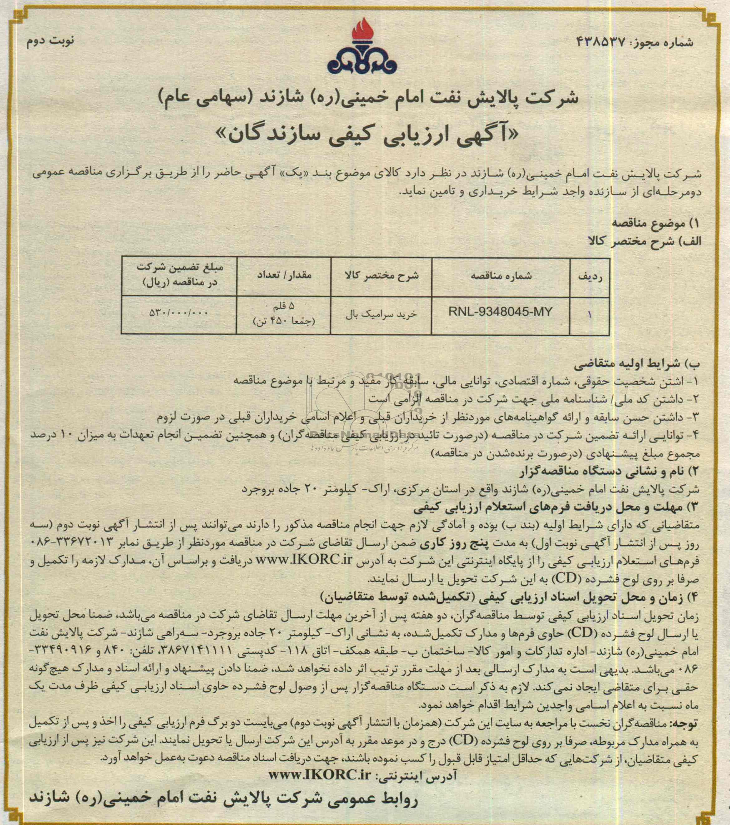 مناقصه خرید سرامیک بال, آگهی ارزیابی کیفی سازندگان,مناقصه خرید سرامیک بال