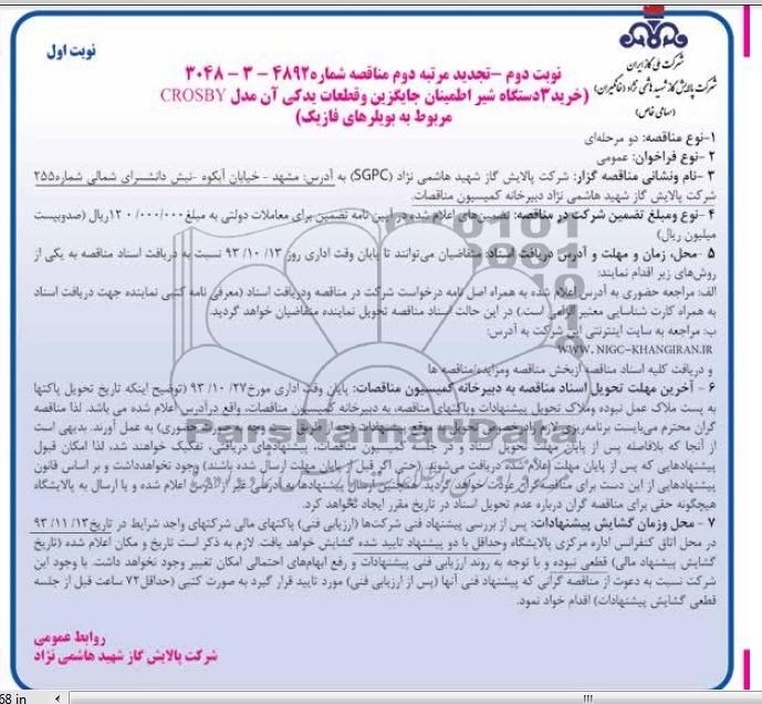 (خرید 3 دستگاه شیر اطمینان جایگزین و قطعات یدکی آن مدل CROSBY مربوط به بویلرهای فاز یک )