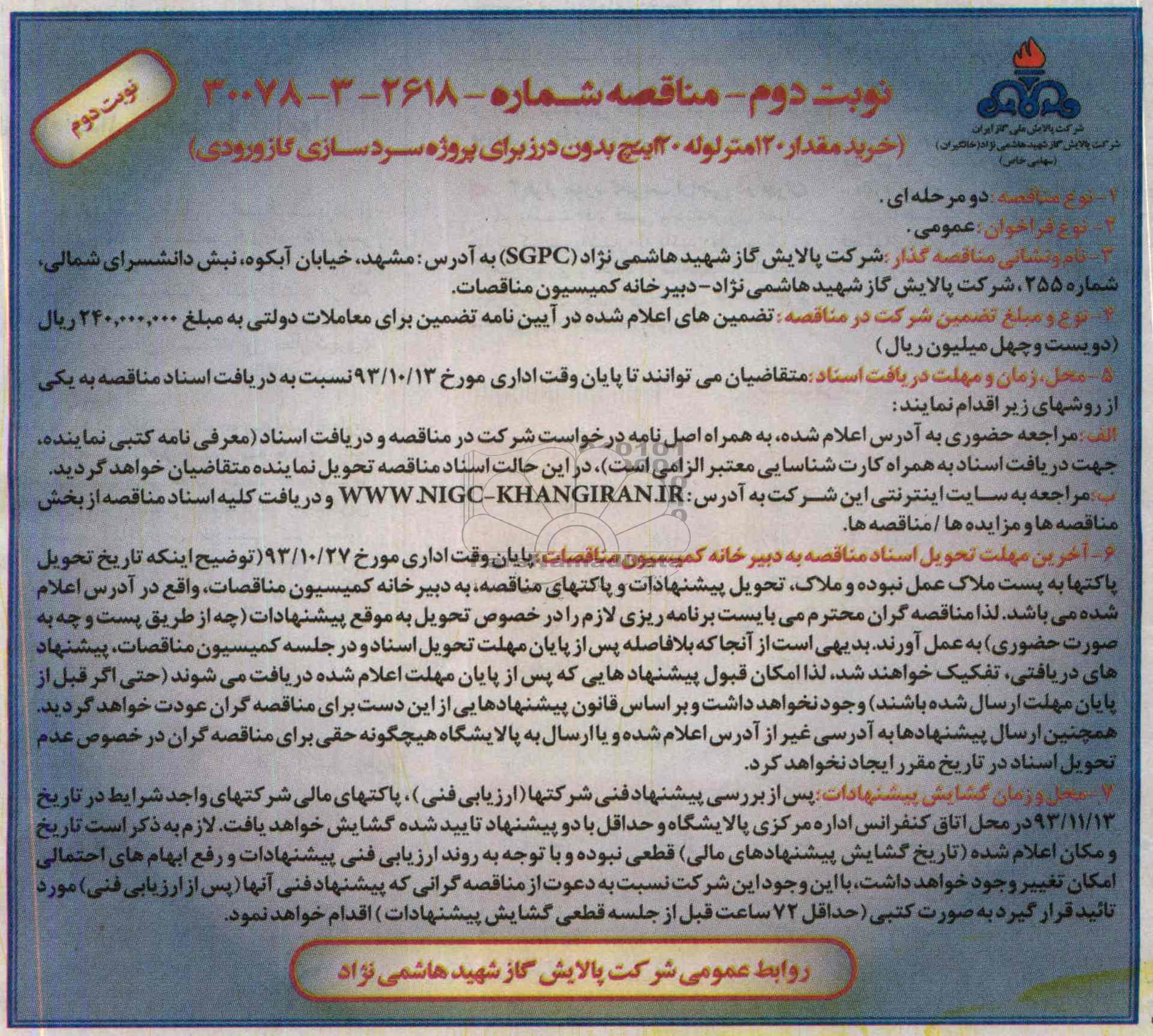 نام و نشانی مناقصه گذار: شرکت پالایش گاز شهید هاشمی نژاد SGPC به آدرس مشهد خیابان آبکوه نبش دانشسرای شمالی شماره 255 شرکت پالایش گاز شهید هاشمی نژاد دبیرخانه کمیسیون مناقصات