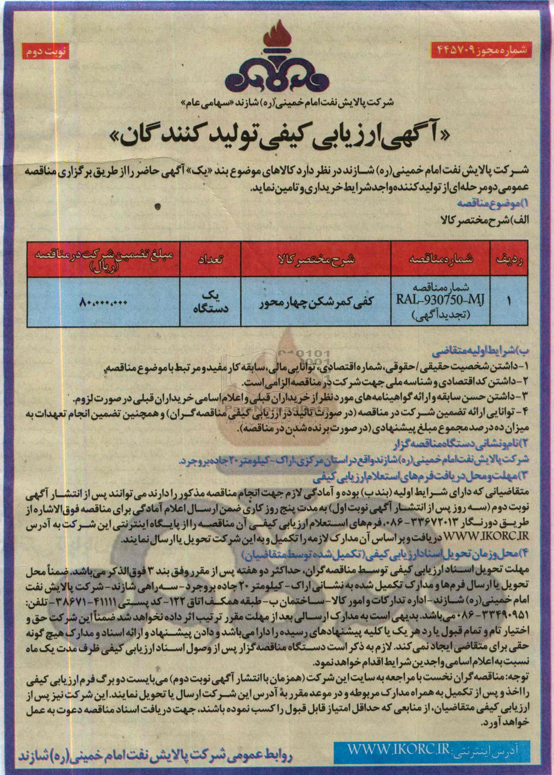 مناقصه کفی کمرشکن چهار محور, آگهی ارزیابی کیفی تولید کنندگان , مناقصه کفی کمرشکن چهار محور