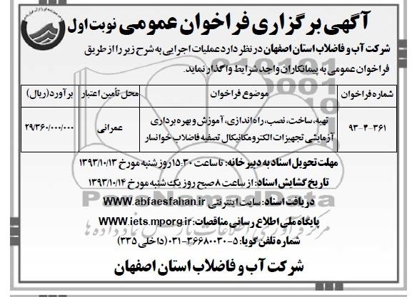 شرکت آب و فاضلاب استان اصفهان در نظر دارد عملیات اجرایی به شرح زیر را از طریق فراخوان عمومی به پیمانکاران واجد شرایط واگذار نماید.