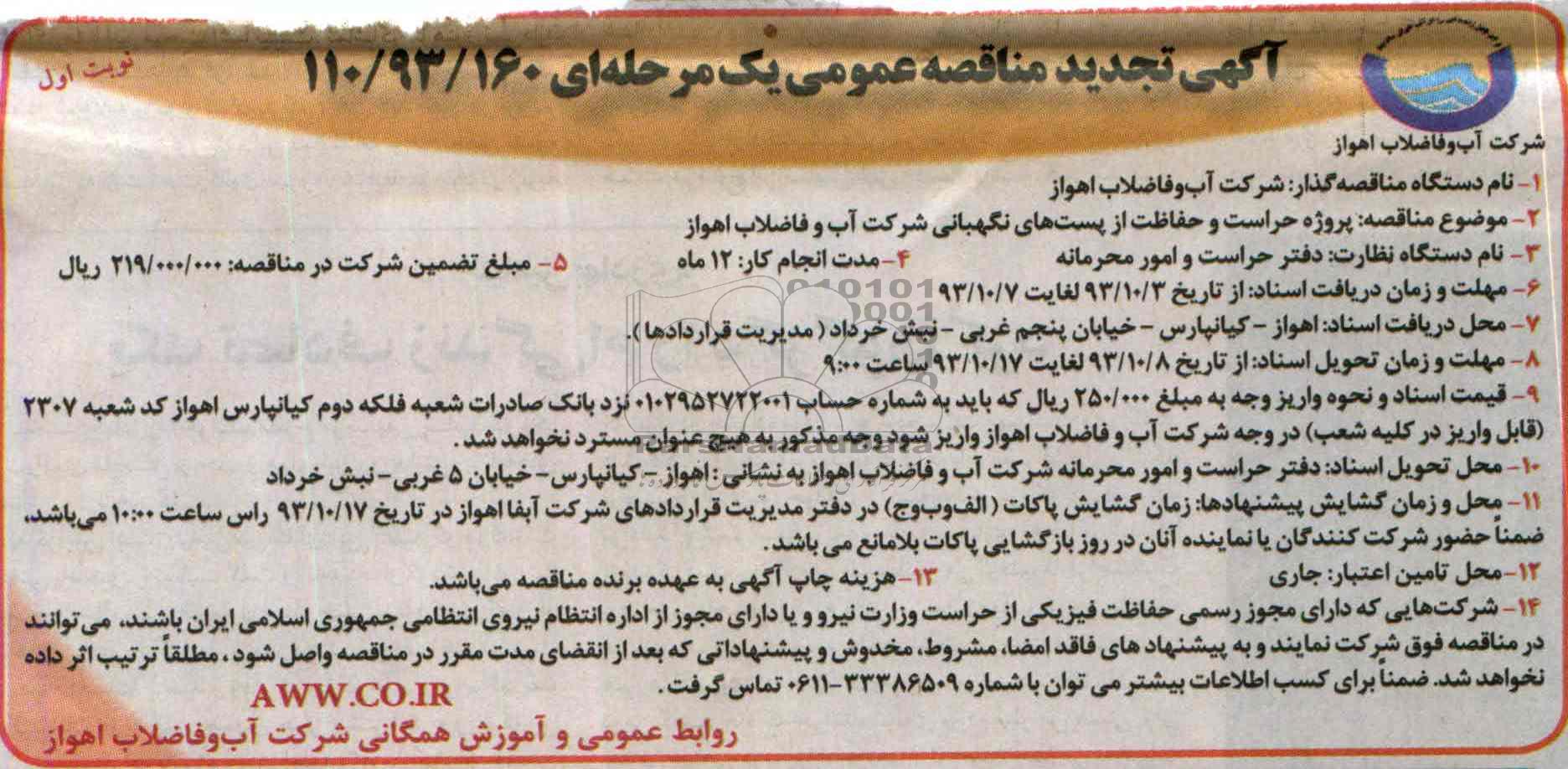 موضوع مناقصه :پروژه حراست و حفاظت از پست های نگهبانی شرکت آب و فاضلاب اهواز