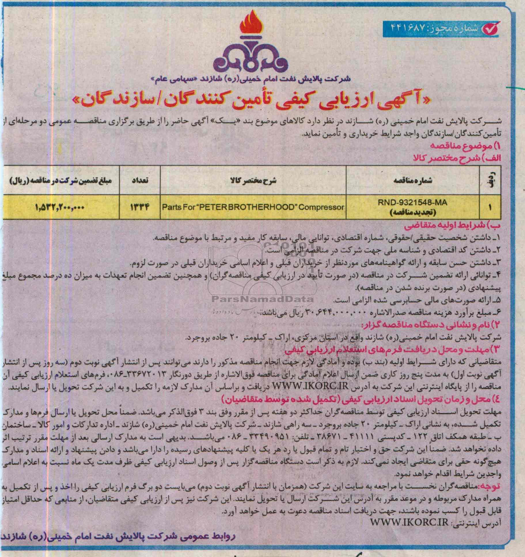 مناقصهparts for peter brotherhood, آگهی ارزیابی کیفی تامین کنندگان, مناقصه parts for peter brotherhood