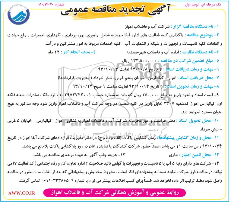نام دستگاه مناقصه گزار: شرکت آب و فاضلاب اهواز